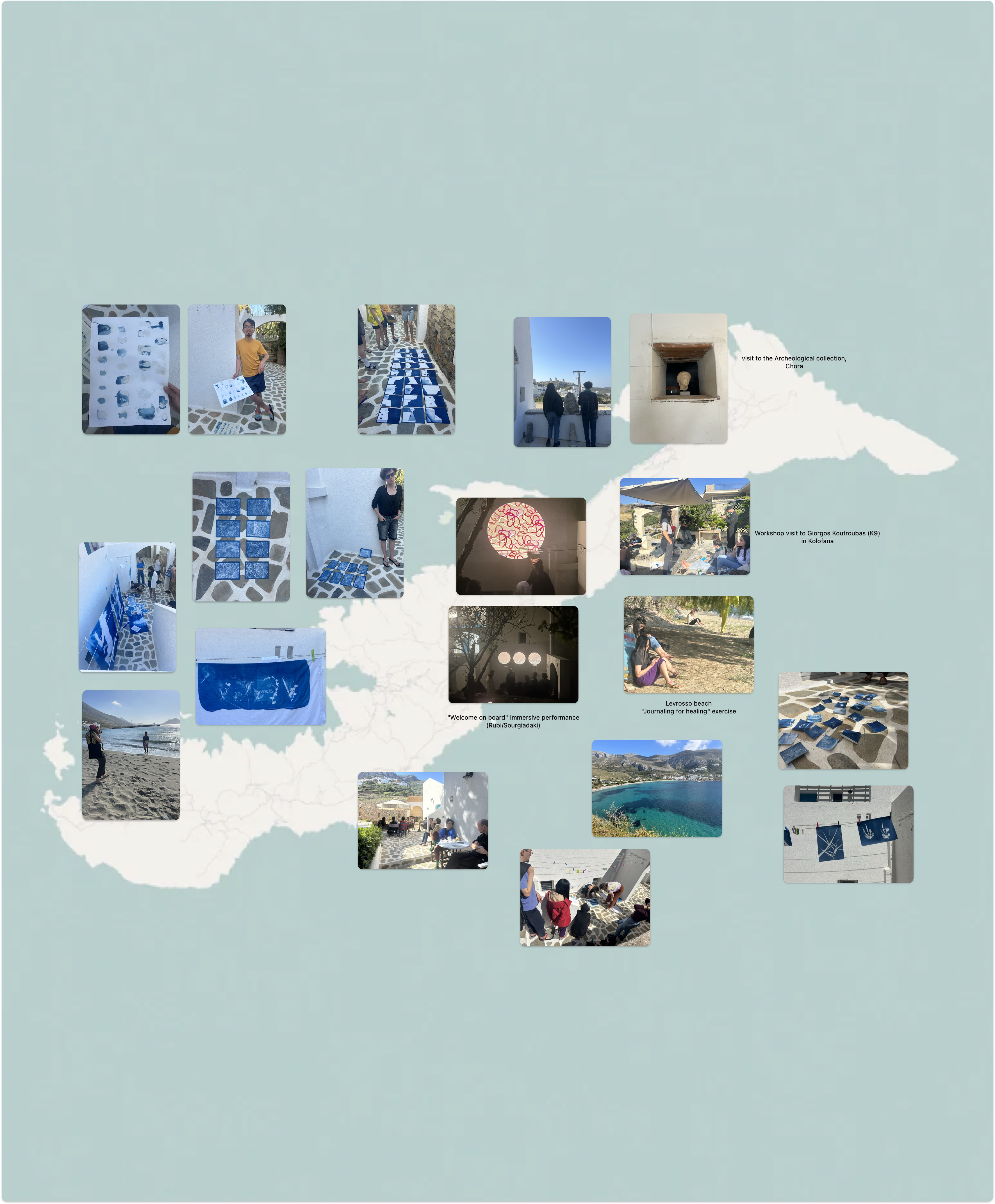 A 2-part module by the MA Transdisciplinary Studies of ZHdK, Department Kulturanalysen und Vermittlung. Held by Anna Rubi & Eirini Sourgiadaki. Autumn 2023-Spring 2024 Colour perception varies, so do the semantics of colour terminology, for both sighted and blind individuals. The questions around colour perception from ophthalmology or neurobiology perspectives to cognitive and artistic ones, are infinite: Is there a universal human experience of the blue sky, the green grass and the brown soil? How is colour perceived in the brain, how is it translated into a communicable concept and how does it affect our perceived world, our mental and physical state? What is the role of colour in synesthesia? And most importantly, does colour have to do just with vision? In this module we work with the generation of blue colour on print, using the major light source available, the Sun. The Island of Amorgos is often referred to as “Le grand bleu” after the famous french film was shot at location. Its ancient name is “Melania”. “Melani”, the Greek word for ink, (“Melano” for dark blue, cyan) as it is said that in ancient times the place was covered with dark green flora. Our investigation begins exactly with this deep tint. We pay a visit to the famous monastery and the water oracle, walk the trails to observe the sensual -not only vision-based- shades of blue. In the spring term, we participate in local activities such as beach clean-up initiatives of the remote bays by local fishermen and their boats. We visit bee-hives and herb-distilleries, we work with the most basic bits and pieces of the island to capture its essence.