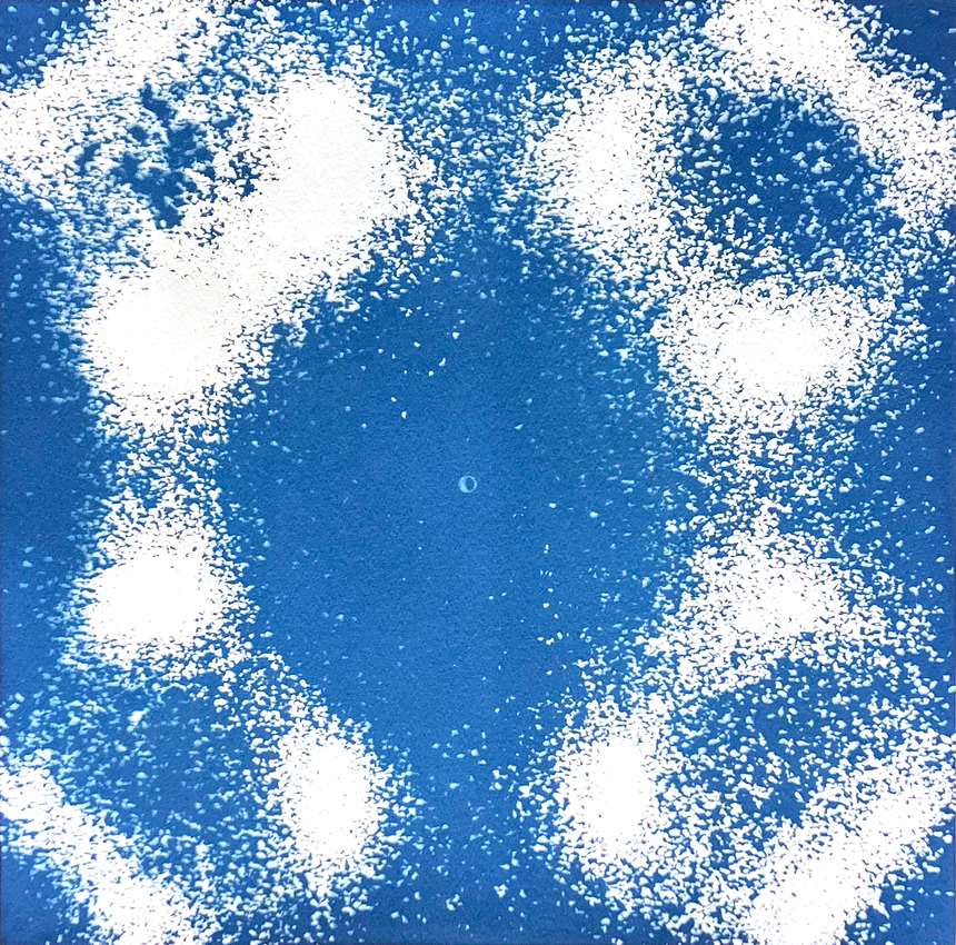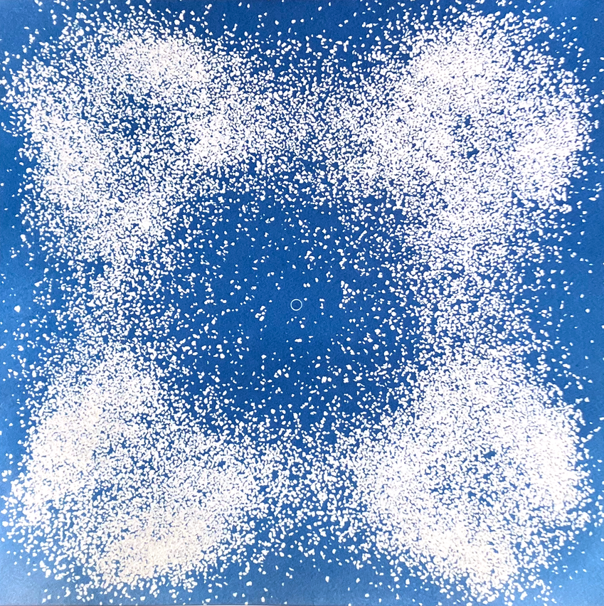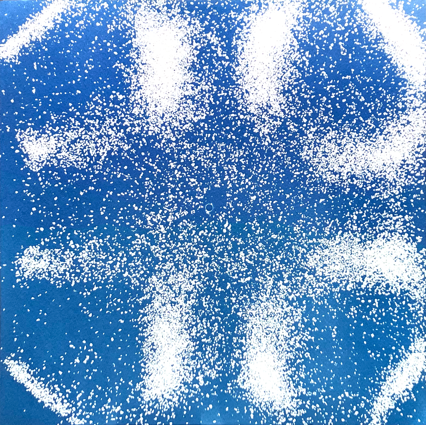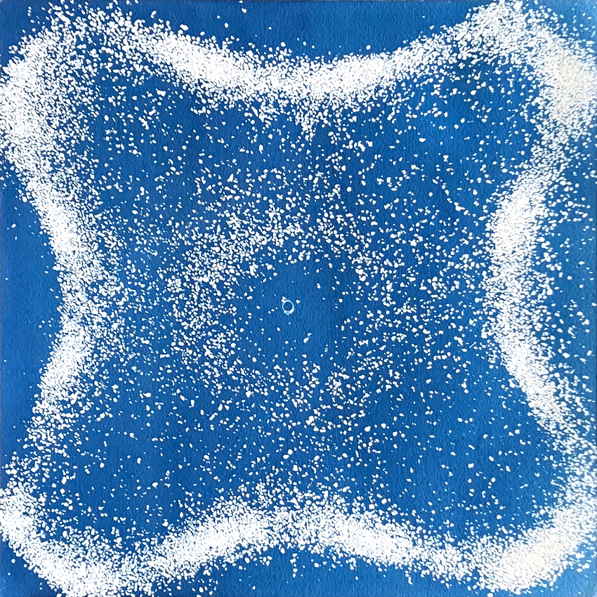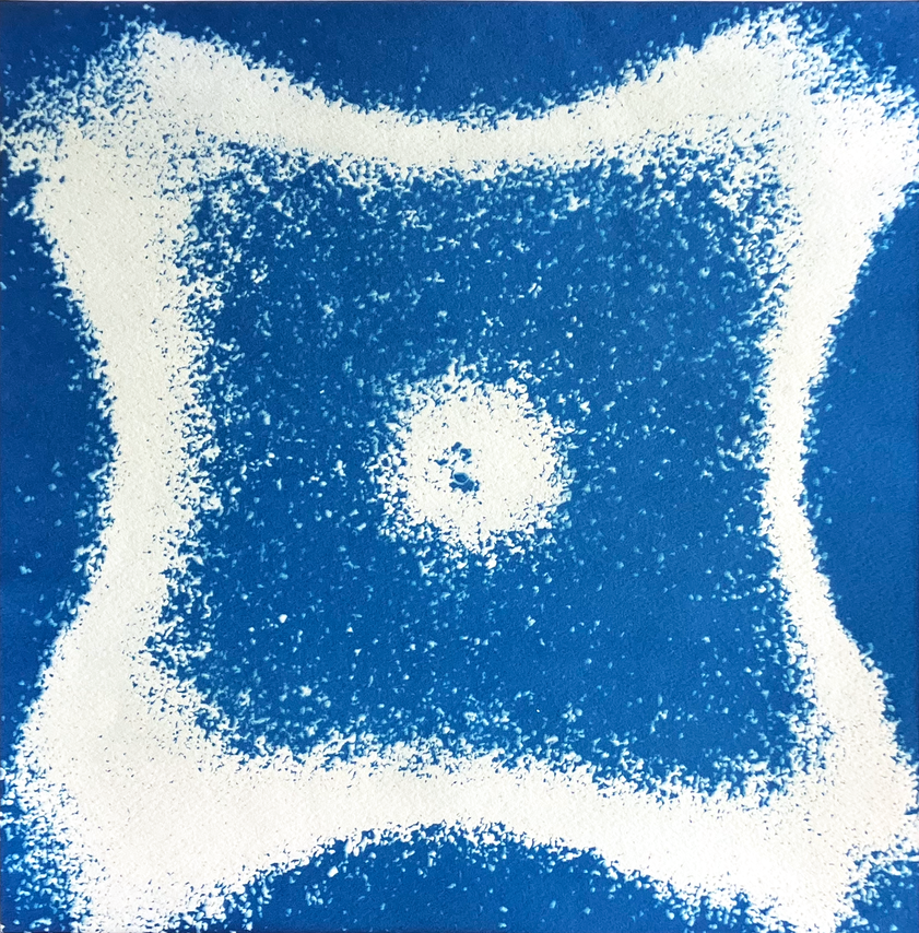 My intention was describing the island through its vibrating sounds and find a way to translate them into the paper. Inspired by the Chladni plates, I built an oscillating plate system with a speaker and a transparent surface. I made resonate the plate using recordings of the island and its sand. I then cyanotype the pattern created by the different frequencies.