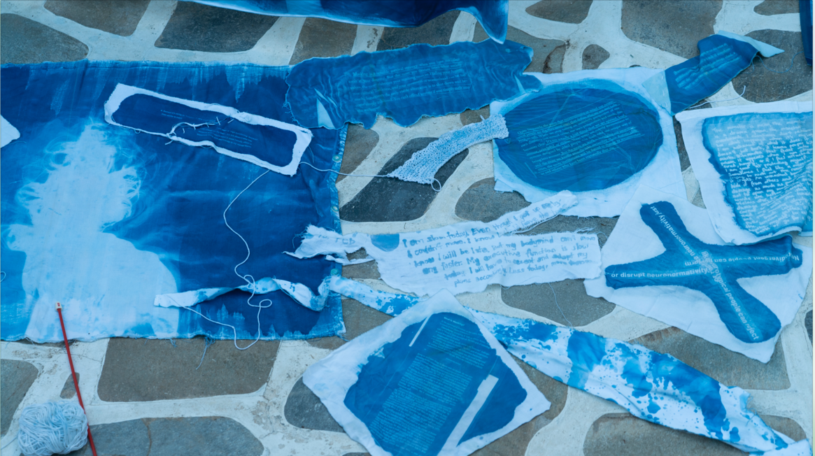 Lovis Heuss' work "digestion in blue" is a textile collage of their current research on the neurodivergent coping strategy called masking. Citations of the academic research are paired with Lovis' documentationd of their personal unmasking practice as well as questions which arose during the unmasking workshops they created. Inspired by "disability as method", the arrangements are an approximation of neurodivergent information digestion through the process of cyanotype imprinting and weaving.