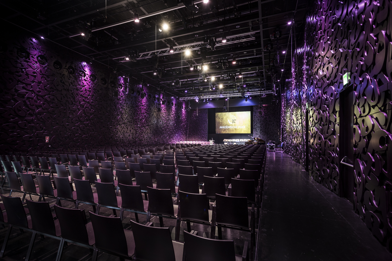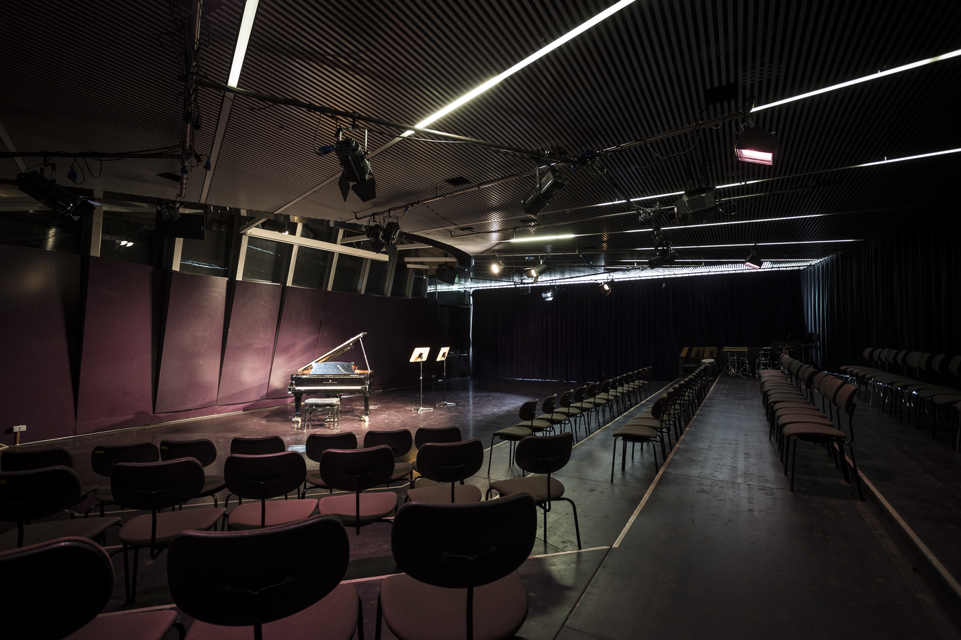 The rehearsal space is a 270 square meters space that is used for orchestra rehearsals and smaller concerts. It has steps in the audience area and variable seating. By default, it is equipped with a stereo loudspeaker setup, stage lights and a video projector. Additional technical equipment can be set up upon request.