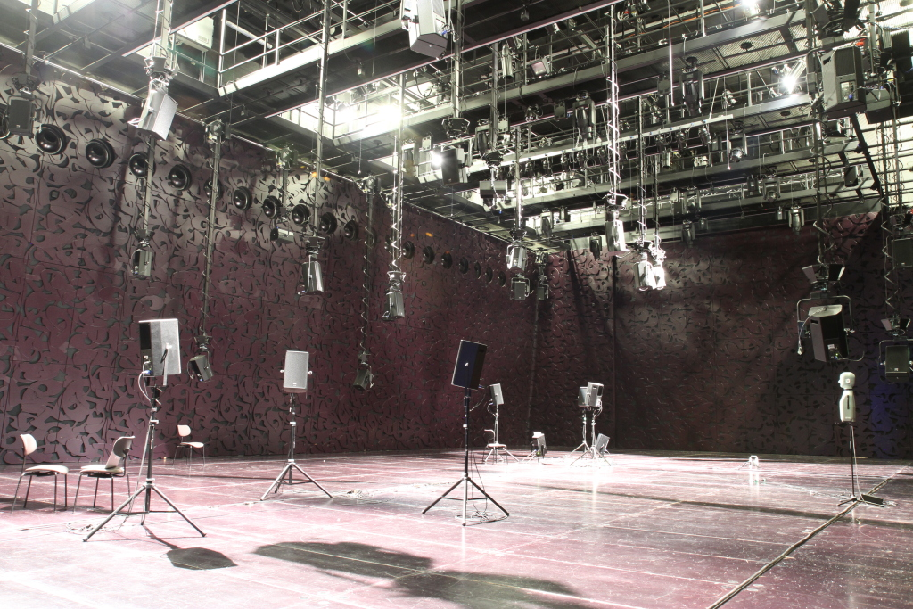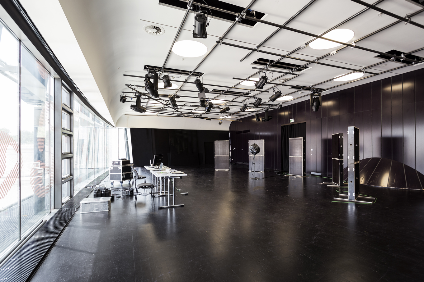 The ligeti hall is a 500 square meters concert hall provided with state-of-the-art technology in particular for sound and video projection. Its floor consists of a series of pedestral elements that, by means of individual motos, can be positioned at different heights in order to realize adaptable topologies. The hall is equipped with a system of 29 loudspeakers mounted on independent, custom made motorized suspensions, which allow to adjust height level, azimuth angle and tilt of each individual speaker and to compose custom individual speaker layouts. Further, an array of 64 speakers, which may be adressed individually, spans the hall`s entire ceiling and upper walls.