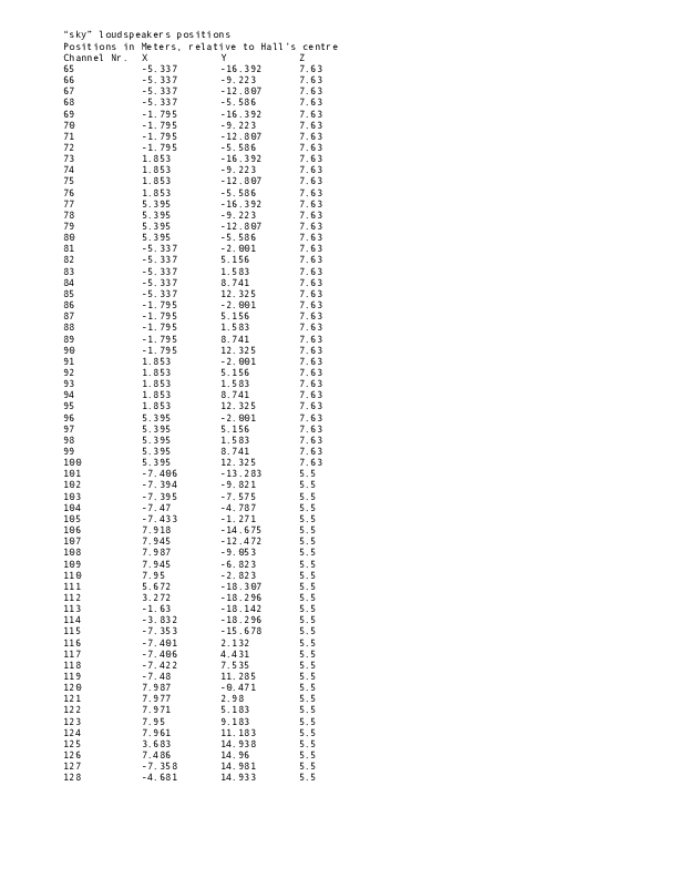 - the so-called "sky": an array of 64 speakers spanning the hall's entire ceiling and upper walls