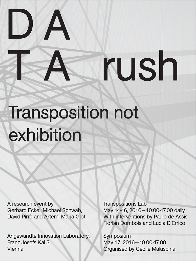 A one day symposium organised by philosopher Cecile Malaspina in the context of the exhibition DA TA rush with Paulo de Assis, Lucia D'Errico, Luc Derycke, Gerhard Eckel, Artemi-Maria Gioti, Wolfgang Hofkirchner, David Pirrò, Michael Schwab, Volker Straebel, Phoebe Stubbs, Mauricio Suarez and Neal White.