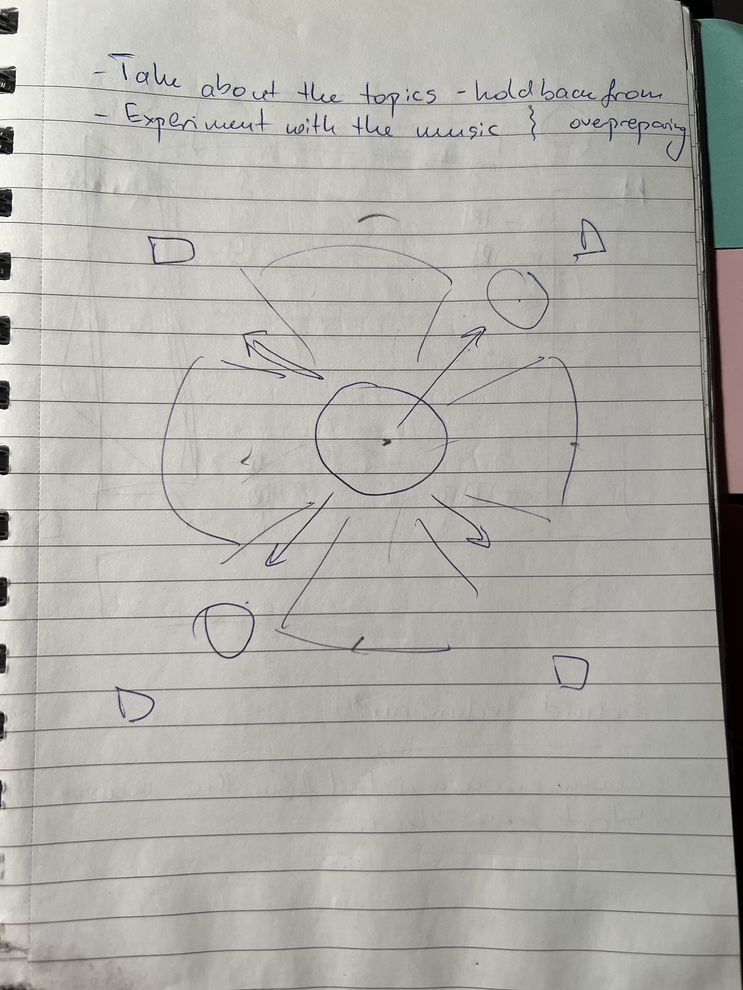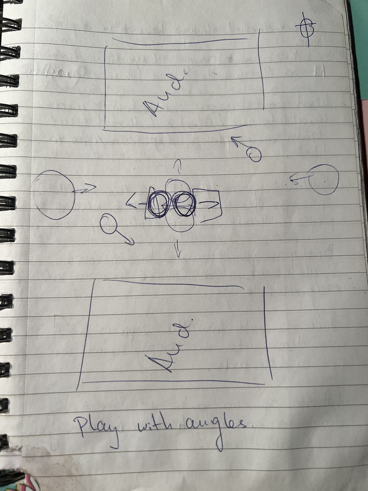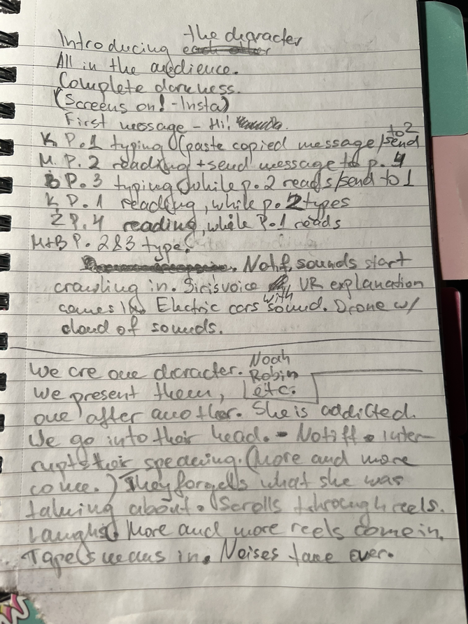 During that first week, despite the lack of two members, I was still working on ideas for the quartet version and writing down scenes (In the slideshow some example pages). In these moments, as mentioned before in chapter I.6.1, I felt the pressure and need to know exactly what I wanted to achieve even before we had experimented and brainstormed as a team. Perhaps the time pressure and circumstances were helping put some extra pressure on working quickly.