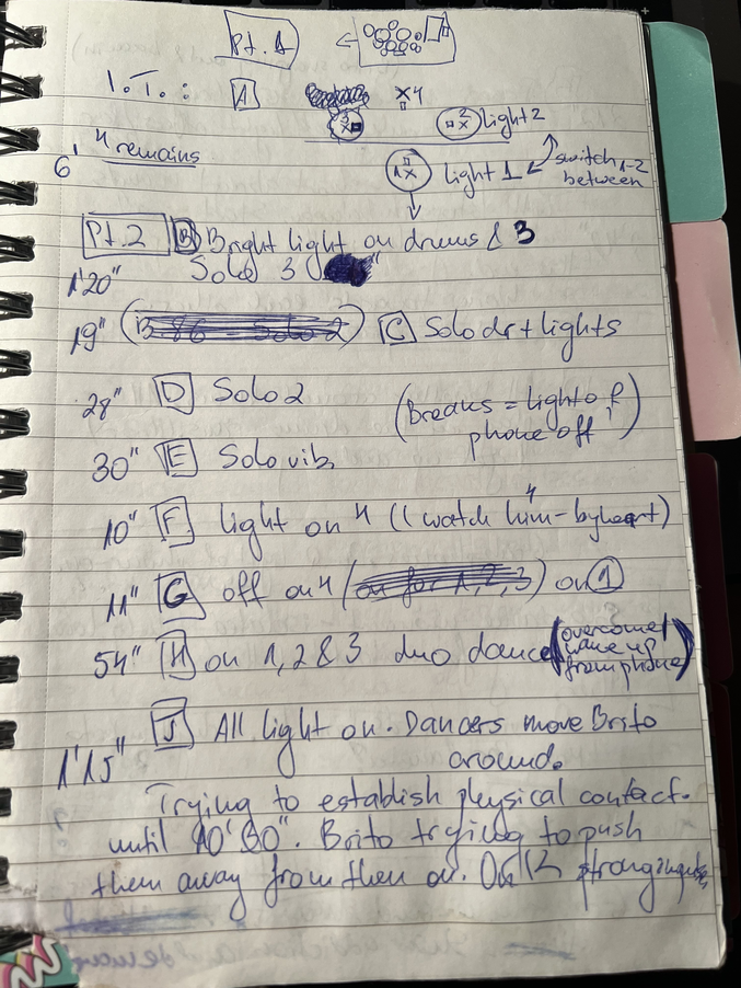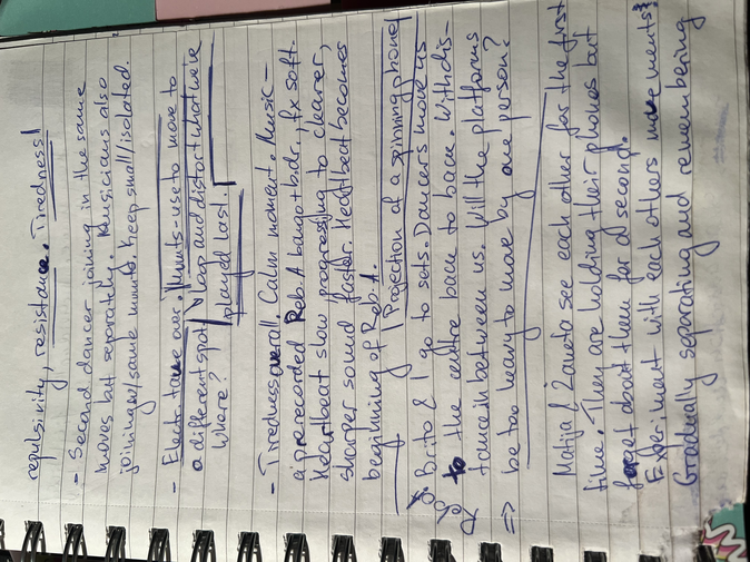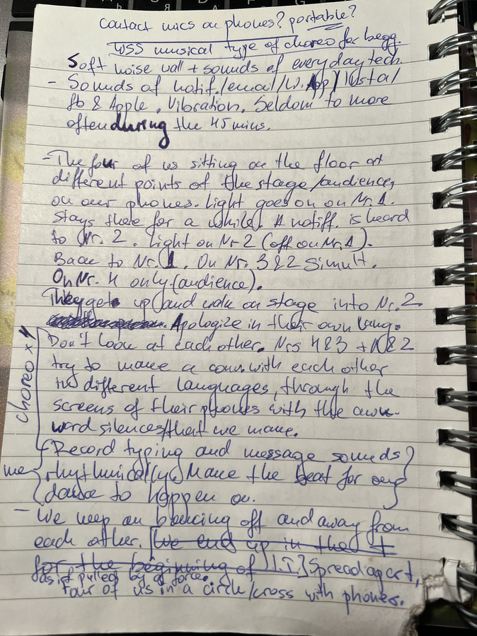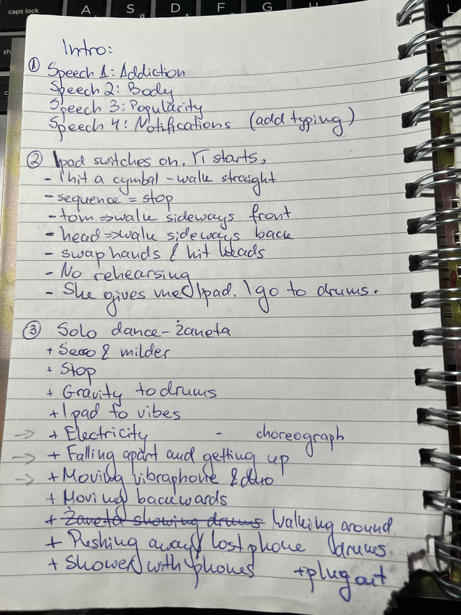 With Zaneta, we spent two days coming up with many ideas for movements, shared moments of intertwining the arts, choreography, meaning, experimenting. (Please see page from notebook)