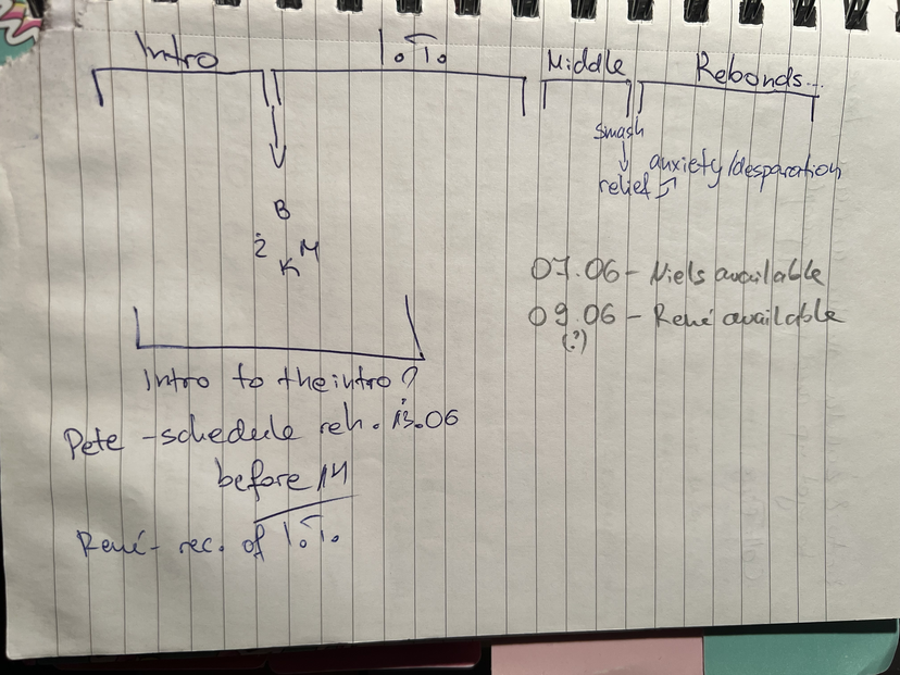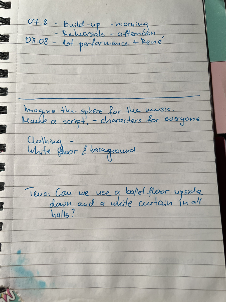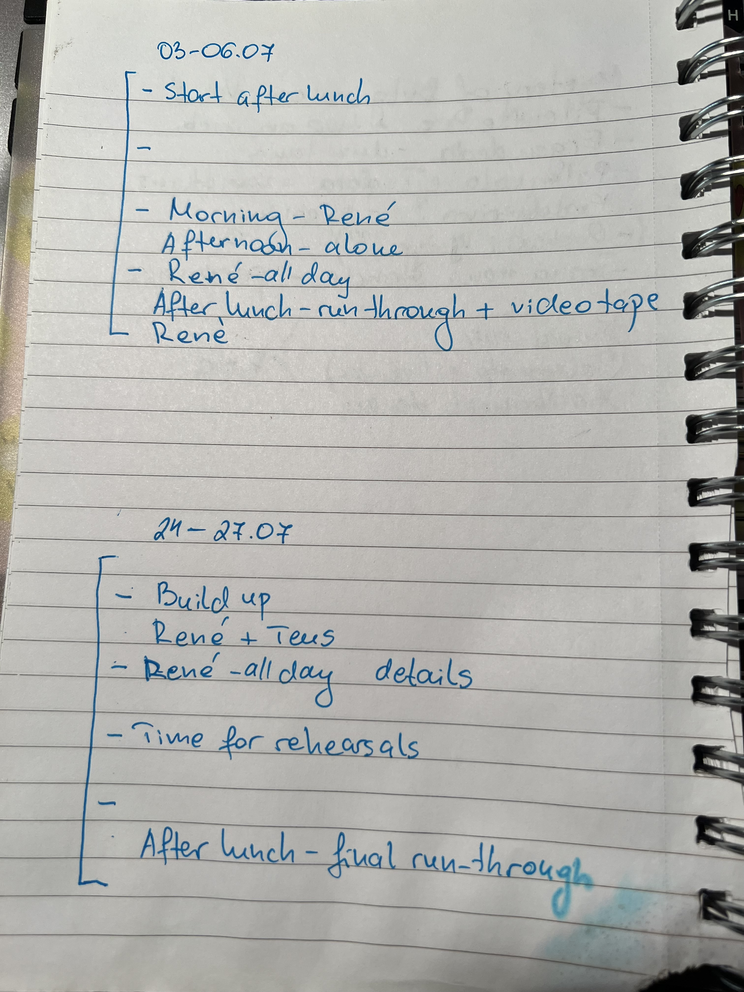 Before the kick off of the second rehearsal week, a meeting with Rene and I took place. We planned what needs to happen until the premiere day and when. That helped bring clarity to how much time we have and how we need to pace ourselves through the rest of the days. (notebook photo of planning)