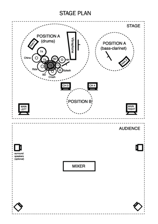 On the other hand, having to adjust this often helped with our flexibility and allowed us to quickly adapt to the performance venues. What needed to be done before every show (after all the technical equipment was set up and tested) was to build up the instruments, check the acoustic (including amplification and monitoring), the lights and the corresponding spots where the performers needed to end up for it to come together and spacing for the performers to orientate how much space they have to move and how much space does the venue require us to use, to make sure that we use the full potential of the stage.