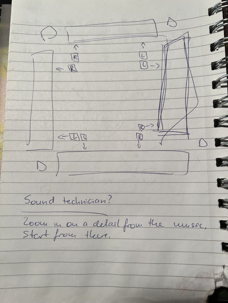 A second example is that I had the conviction that we needed click tracks to be able to synchronise movement and sounds from the tapes that were to be played, as the idea was for them to include notification sounds as cues for specific transitions, that were meant to occur simultaneously with the sound. After a discussion with the rest of the cast we got to the conclusion that that would be useful but rather impractical.