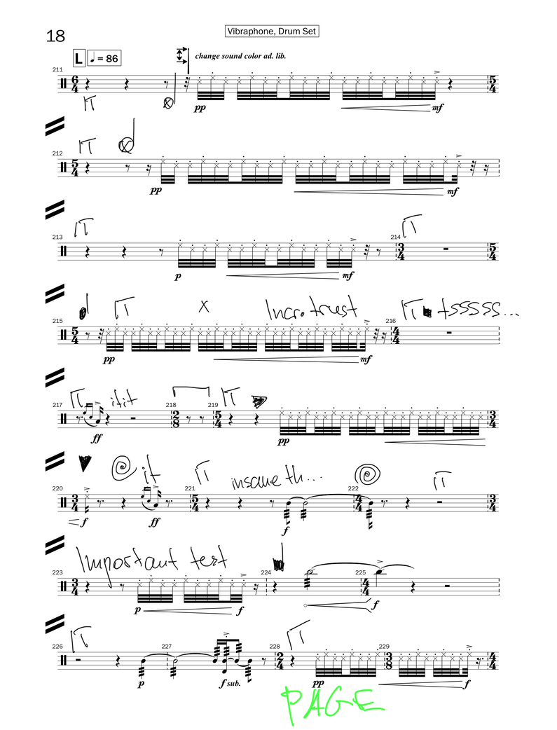 The next section, where the dancer had to play an instrument, was once again in IT. This time it was happening around the drum set. What I did there was once again to alter the score in such a way that it would be little noticeable sound-wise and yet much more simplified. (Please refer to copy of the score page) How I altered the rhythm to help Zaneta play with ease was instead of playing rllrllrllrll (r=right hand; l=left hand), we changed it to simple alternation (rlrlrlrlrl). The effect of fast alternated notes ended up sounding nearly the same, perhaps even better as we were playing on two different drums at the same time. Our approach for that section was mostly the same as by the vibraphone – we learnt the aural cues of the tape and the words or noise signals that we had to search for. We would shift to a different drum for each new segment. This time I did not need to cue the entrance as much. Here choreography came into play, as we were physically shifting from one position around the drums to another. The time to reach the next drum filled in the rests in the score. Via repetition we, both physically and aurally got used to the timing of the tape and movements. This was a spot, where choreography and music were inseparably intertwined. I needed to remember where to move to each time we played a new drum and that activated new ways of thinking and contextualising performance for me.