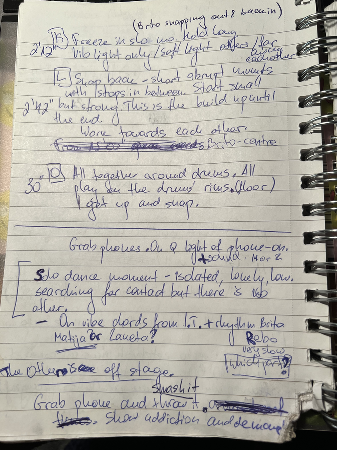 Because of time constraints and lack of technological skills and availability we dropped the idea of a second layer tape with notifications and buzzing devices around the audience. The idea of Brito being a central character in IT also dropped. He joined me at the vibraphone and the dancers mostly improvised on the spot every day, each creating a narrative for themselves and for the group picture. The ending of the piece was planned in a certain way until the first feedback moment with René that same week. A drastic, rather controversial suggestion was made and that became the pinnacle of the entire show. To keep the suspense and chronological order of the story, I will postpone sharing what that suggestion was until the end of this section.