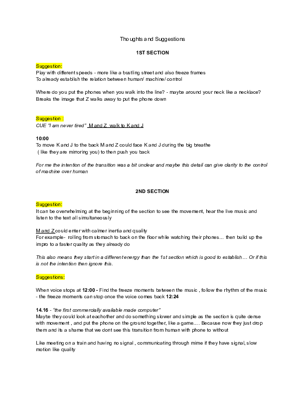 Of course we ended up changing a lot of it throughout the rehearsals but it was a strong departure point for the work and provided me with some more comfort, going into the first meeting with the cast.(Please refer to Chapter III. “Rehearsal process” for the development progress).