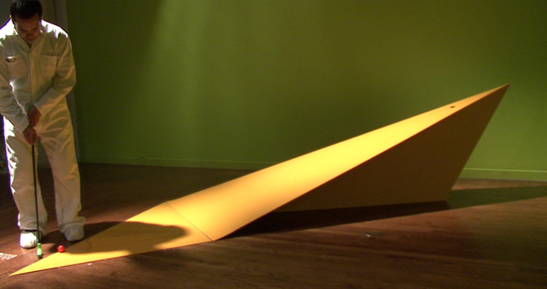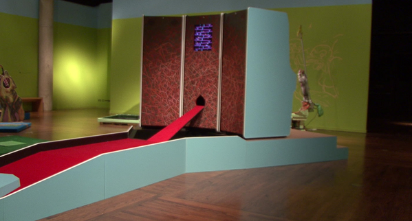 In the summer of 2010 the Salt Lake Art Center, now called the Utah Museum of Contemporary Art (UMOCA), mounted an exhibition of an 18-hole miniature golf course entitled Contemporary Masters: Art-Inspired Miniature Golf. Eighteen different artists from across the United States were invited to design and construct a hole for a miniature golf course. Fourteen Utah artist’s were selected after submitting a proposal, and four artists from other locations were invited based on their past work. Each Utah artist who was selected was given $2,500 to construct their creation, while the four invited artists were given an additional $750 to offset shipping costs that they might incur. The curator, now executive director of the museum, initiated this fully playable art exhibition to counter the public sentiment that contemporary art is inaccessible and unapproachable. His idea was to organize an art experience within a context that was somewhat familiar and fun, through which current and significant issues could still be addressed by contemporary artists with an actively engaged audience.