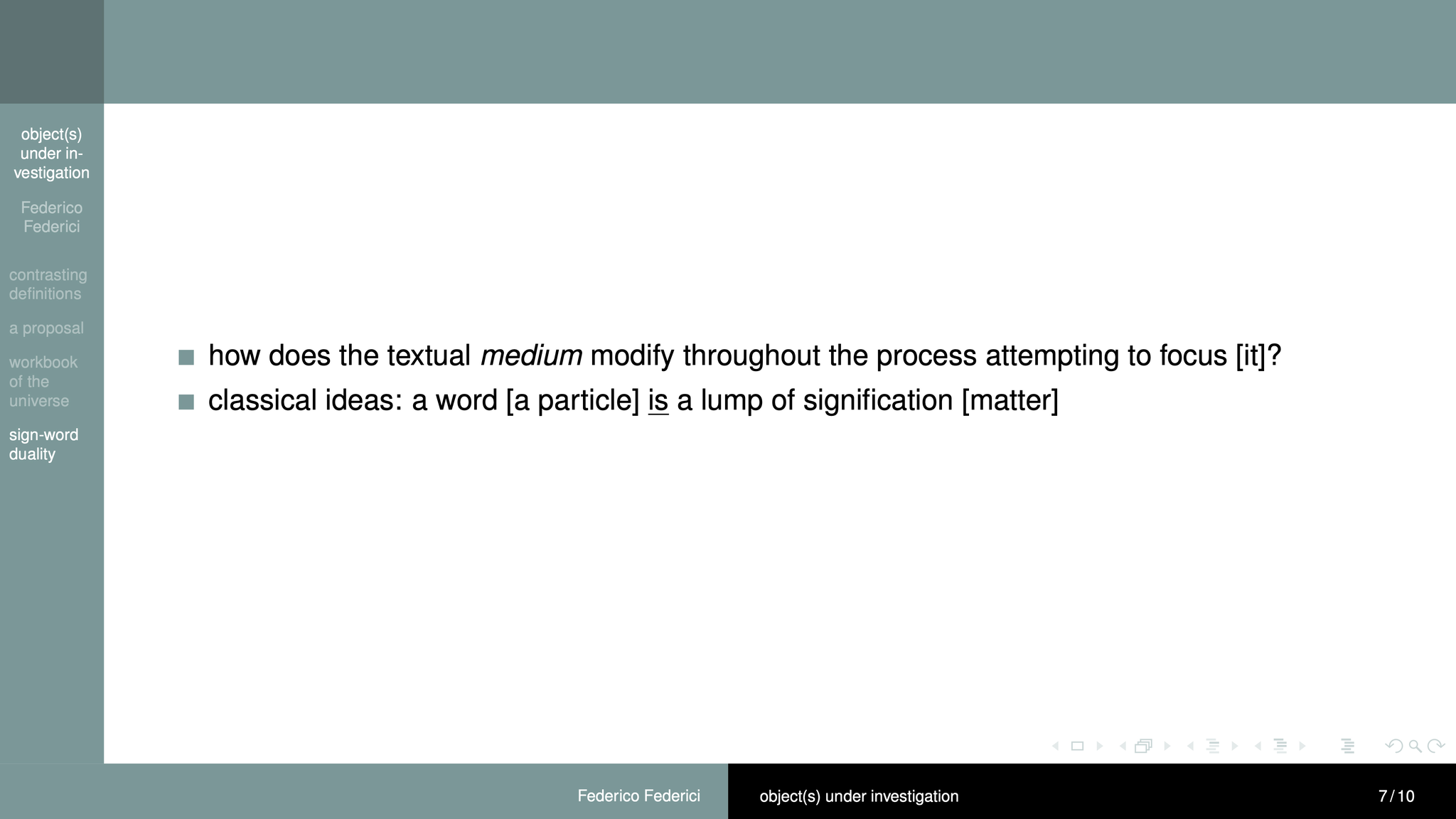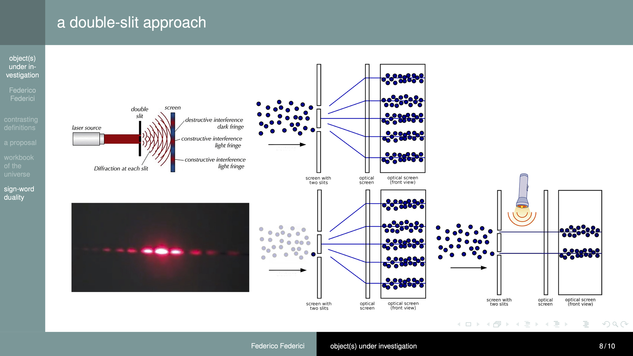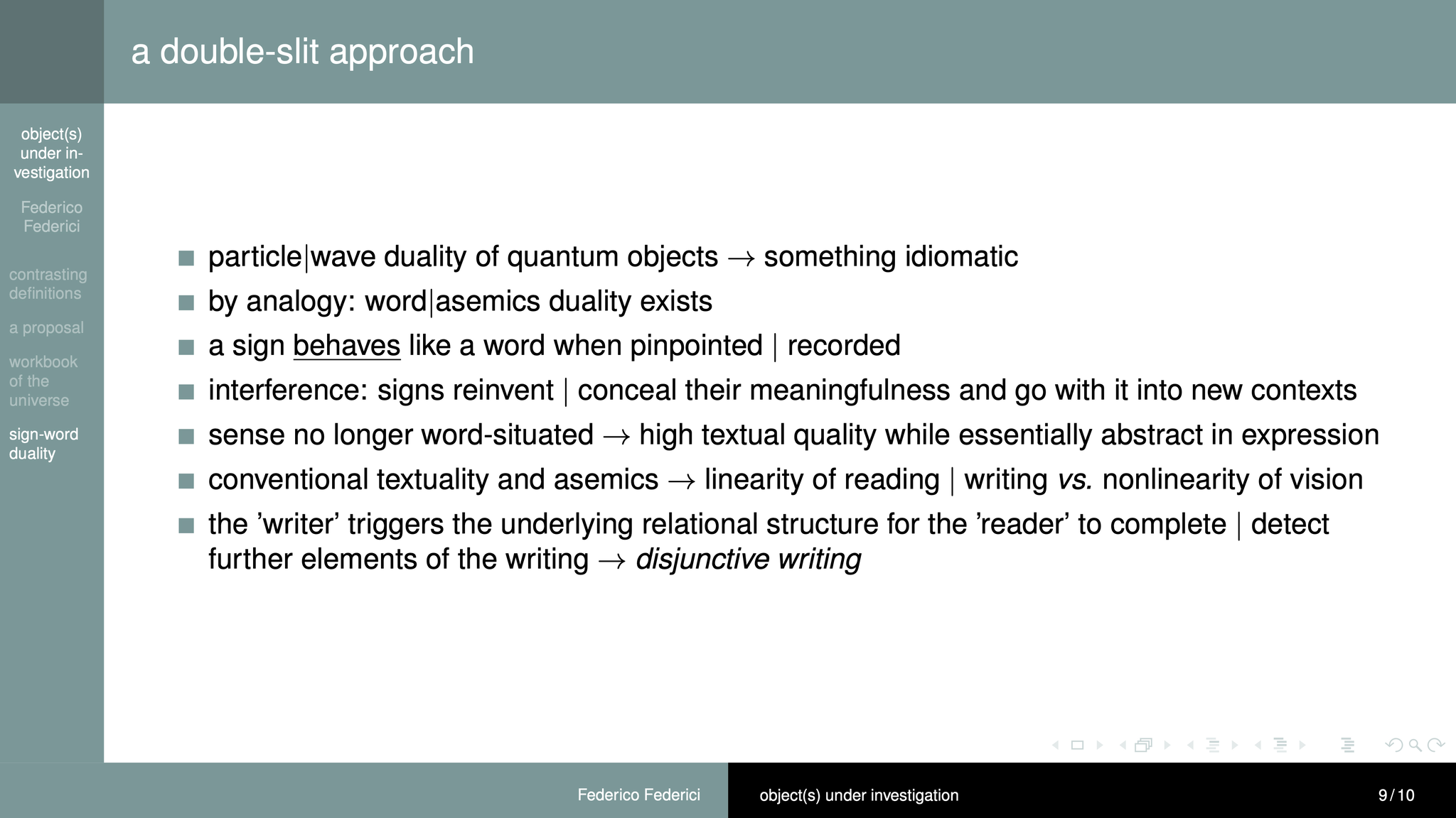 That being said, quantum mechanics provides an inspiring framework to discuss and develop the word-sign duality. But before diving into that, let me first introduce a couple of widely accepted ideas: a word is a lump of signification just as a particle is a lump of matter; when you observe a sign conventionally identified as a word, you immediately access its signification.