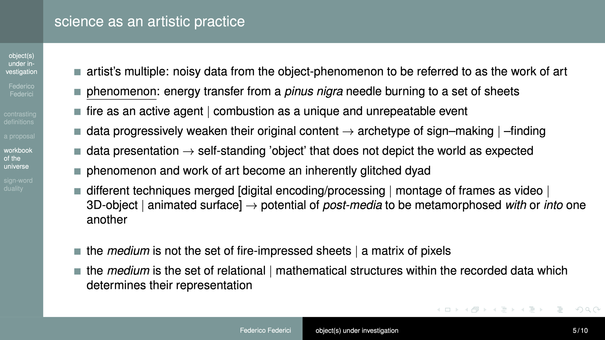 The medium is not the set of fire-impressed sheets, nor the matrix of pixels that their digital images consist of. Its relational and mathematical structures, fed into ImageJ—a tool developed for scientific analysis, not artistic purposes—allow different representations (montages of frames as videos, 3D-animated objects, or surfaces). In light of the theoretical framework outlined, the latter occupy a space between the data attached to the experimental paper and the glitched images of the dyad formed by the work of art and the phenomenon.