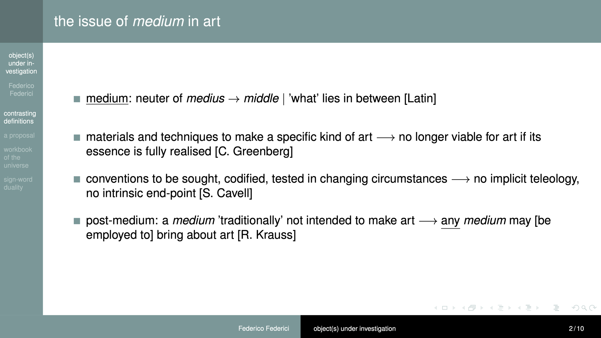 The unresolved ambiguity between the singular and plural forms will be explored in greater detail throughout the talk. This ambiguity is directly tied to the inclusive concept of medium that contemporary art engages with.