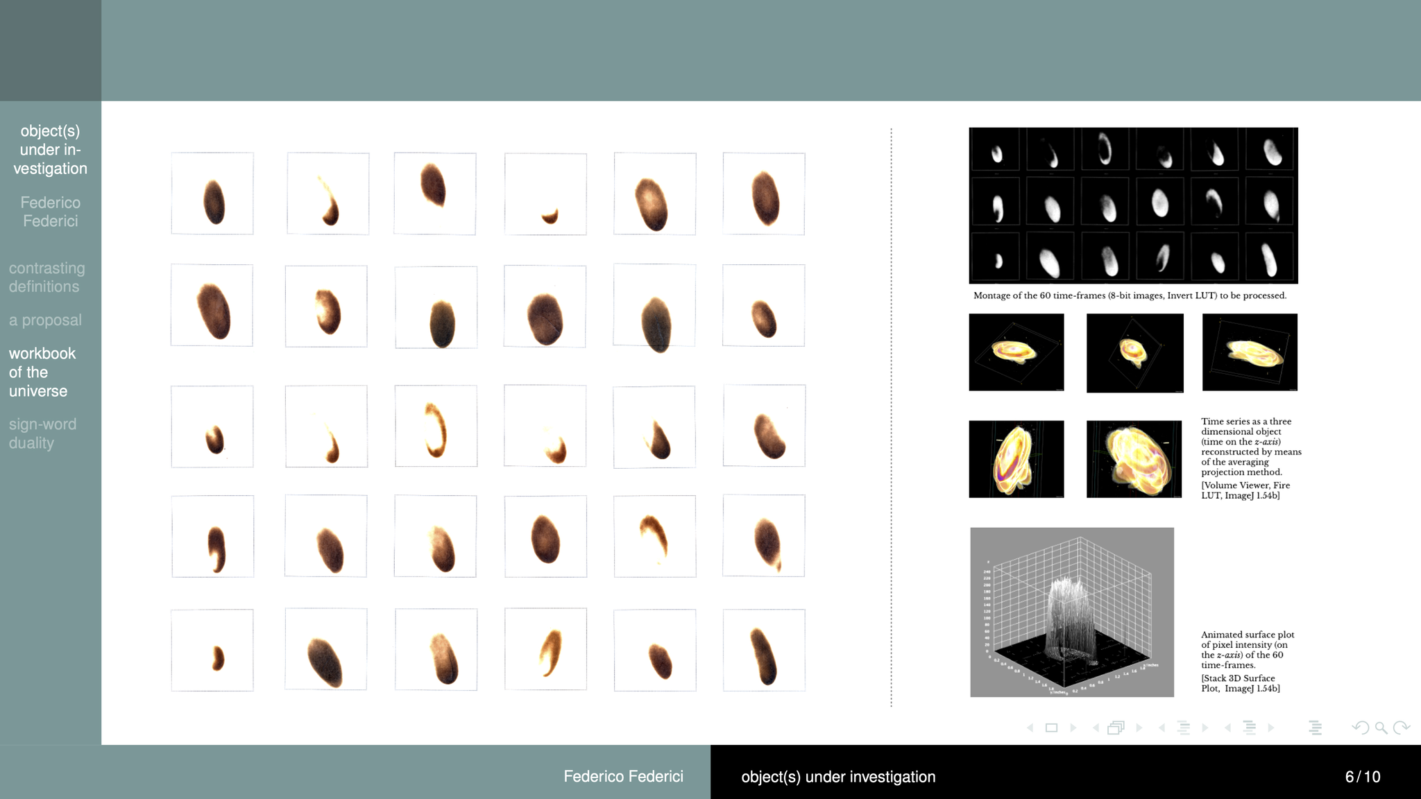 Here is an excerpt from the Research Catalogue archive. From left to right: a collection of fingerprint-like traces of the fire; a preliminary montage of the same frames as 8-bit images, to be rendered as a video; the time series as a three-dimensional object, where time is treated as a spatial dimension on the z-axis; and an animated surface plot of pixel intensity. The superposition of these different representations accounts for how the medium reacted to both the physical and artistic stimuli, depicting the phenomenon in a non-trivial way.