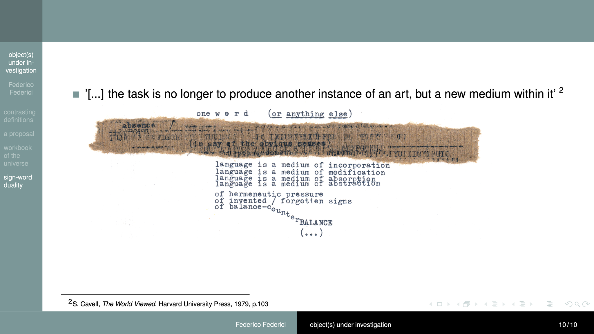 The relational structure is the true essence of the textual medium. It encompasses the metrics set by the printed, painted, typewritten, handwritten, or generative signs, combined with a variety of materials (papers, cardboards, plastic sheets, glues, etc.) that potentially enrich and complicate the linguistic stack.