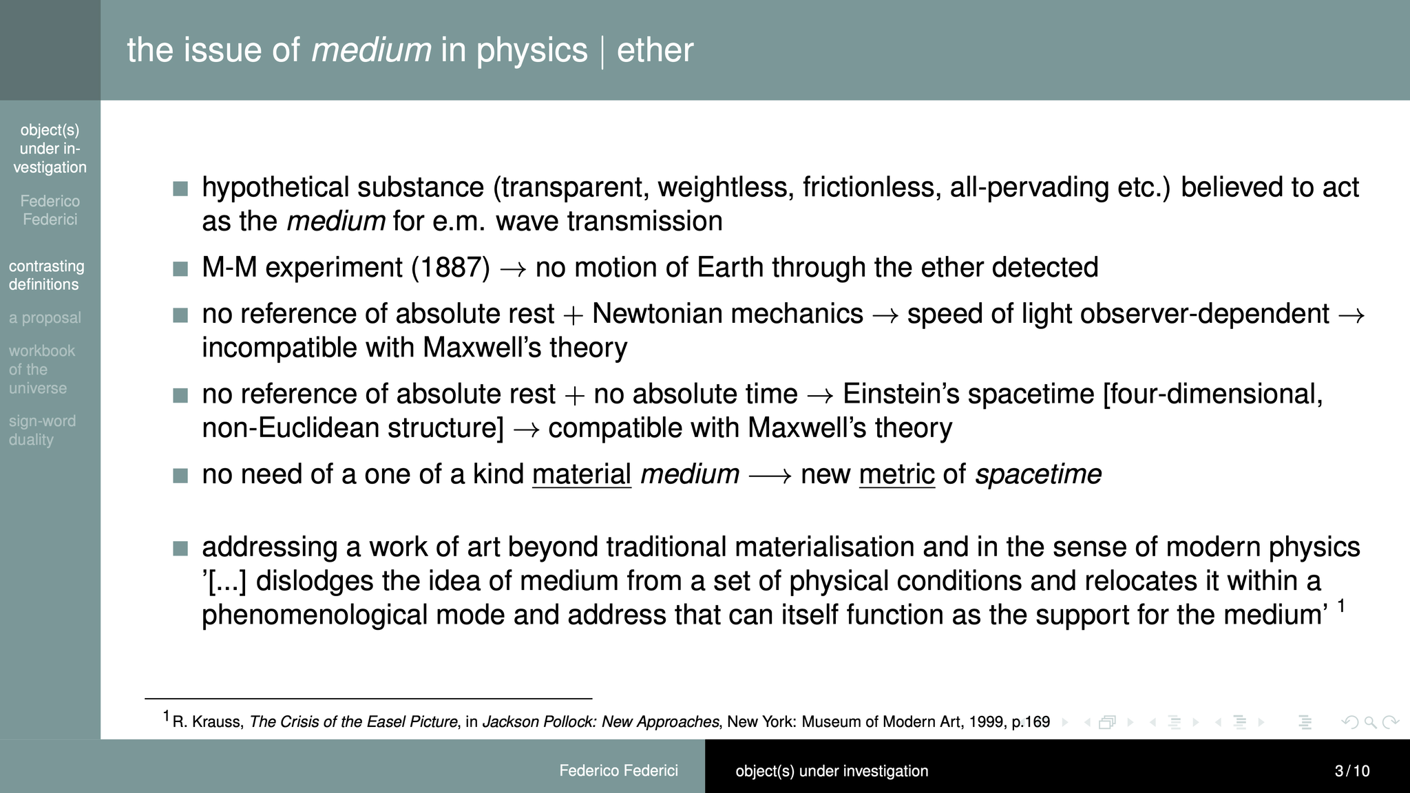 A medium is an intrinsic characteristic of the phenomenon under investigation (specifically, of artistic practice), whose essence is revealed through the incompleteness (or even failure) of its translation. This is exactly what occurred in the negative result of the aforementioned Michelson-Morley experiment. From a linguistic point of view, a medium functions as an idiom within a particular art practice. It is the trait that cannot be fully translated or transferred to another practice.