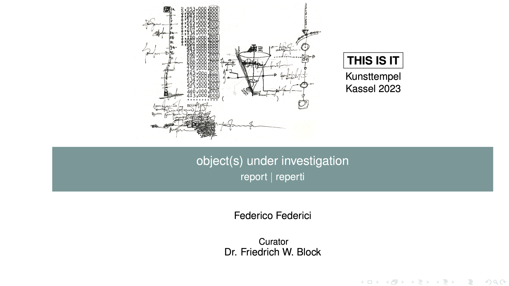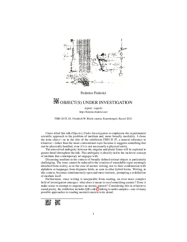 I have titled this talk Object(s) Under Investigation to emphasise the experimental scientific approach to the problem of medium and, more broadly, mediality. I chose the term object—as in the title of the exhibition THIS IS IT, a neutral reference to whatever—rather than the more conventional topic because it suggests something that can be physically handled, even if it is not necessarily a physical entity.