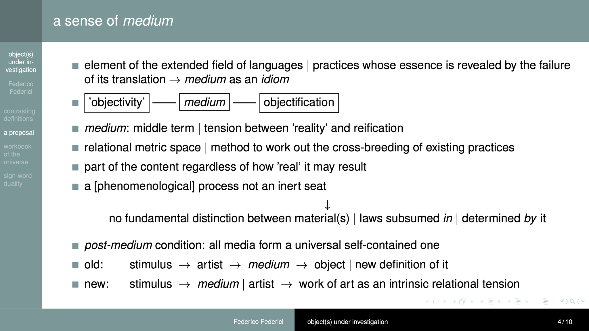 A medium acts as a middle term between "reality" (whatever one may define it as) and "reification," or, narrowing the scope, between the aims of an artwork ("objectivity") and its ultimate composition (‘objectification’). It is a ‘tension’ in which objectivity and objectification tend to overlap (while rarely or only partially doing so), and in the sense of the tensor, which defines the metric of the space (mathematical, artistic, and so on) under investigation — i.e., the tools that establish the proper relationships between the "objects" involved.