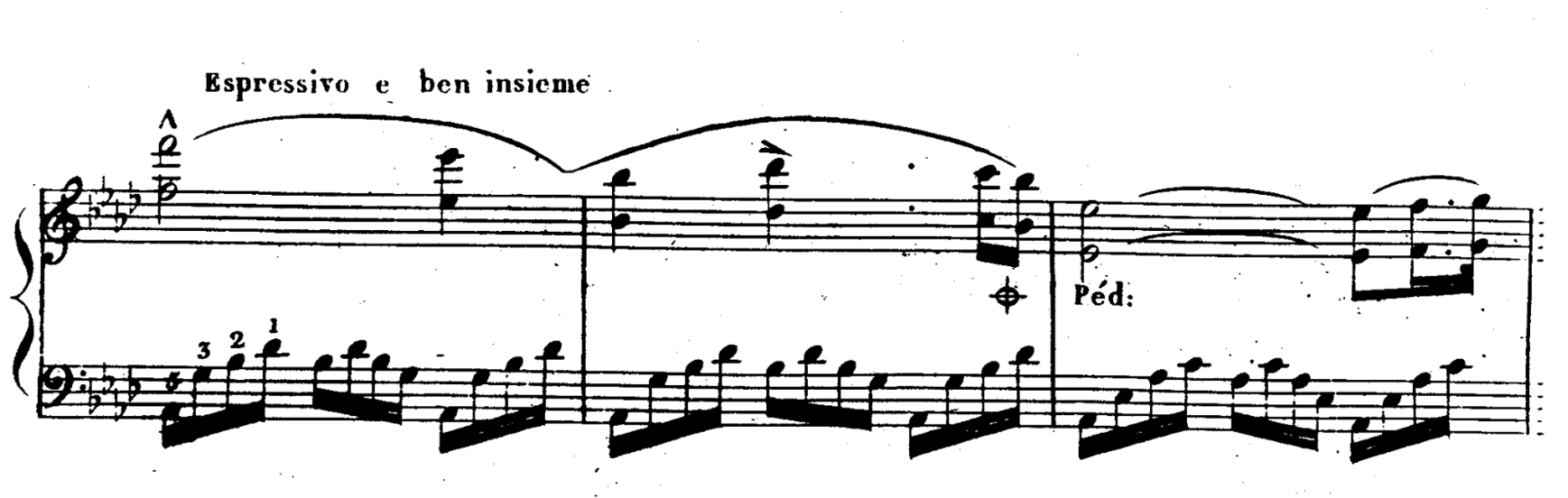 piece, he wrote "espressivo e ben insieme" at the beginning of the right hand's octave melody and at the arpeggio figures accompaniment left hand (Fig.2). However, Kalkbrenner