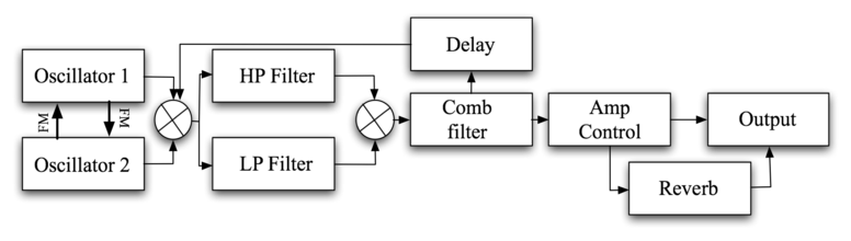The sound engine (Figure 4) consists of two intermodulating oscillators, high and low pass filters, comb filter, amplitude control, and reverb. Important musical parameters are controlled by vector components, which sum up to approx 30 synthesis and control parameters respectively. However, some parameters are under direct control from assigned knobs and faders, such as oscillator waveforms.
