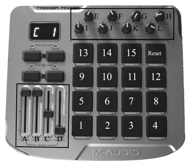 The design of our instrument makes use of commercially available equipment: the M-audio Trigger Finger is a midi controller, which consists of an array of sixteen pads that sends velocity and pressure data, in addition to a number of faders and knobs, while mapping and sound generation take place within a Clavia Nord Modular G2.