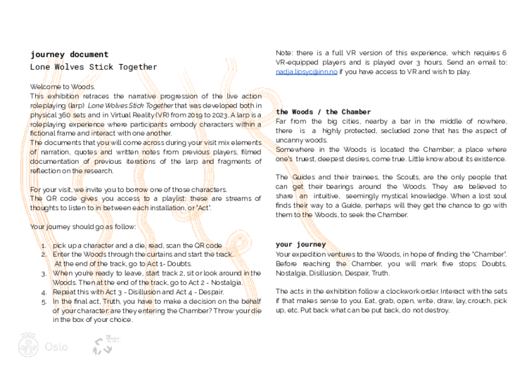 This research explores the artistic and critical potentials of using tools from live action roleplaying (larp) to create narrative VR experiences. In particular, it unfolds the conception, physical play and VR play and production of the live action roleplaying (larp) Lone Wolves Stick Together. Inspired by the film Stalker (1979) by Tarkovsky, Lone Wolves Stick Together stages the immersive environment as an omniscient Sphynx-like character that pushes the players to question one another and to introspect. By using larp and video game design knowledge conjugated to cinematic aesthetics, this research project seeks to honor the creative and narrative potentials of immersion and participation. As such, between 2018 and 2023, this research took the form of classic chamber larps, immersive theater experiences, scenography installation, VR larps (including two other projects: The Space Between Us and Ancient Hours) and a final multimedia installation. The artistic methods rely on principles of environmental design, explored physically through production design and ambisonics, and virtually through a highly reactive virtual environment. The research method is based on a constructivist approach where we experiment to find an answer, not the truth. Here, experimentation is not conceptual but aesthetic: knowledge is lived and felt through artistic experience. Centred around VR and within a film and new media context, this research also develops a reflection on the industrial and technological influences on the creative process and their friction with artistic-research.