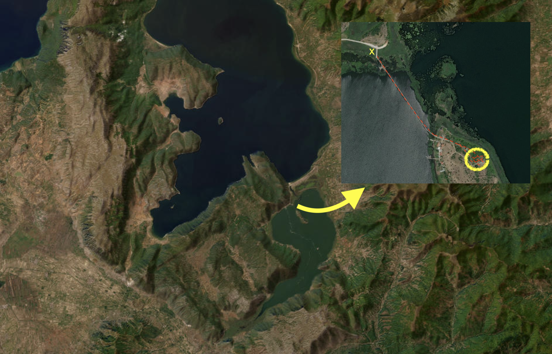 Welcome [~5']: Audience gathers on the side of the lake and near the bridge to the Ag. Achillios island; see point marked ‘x’ on the map above. The author welcomes the audience dressed in a military uniform.