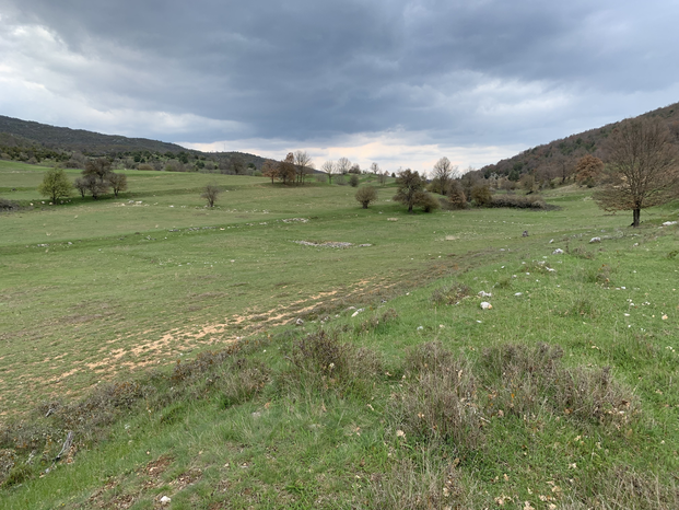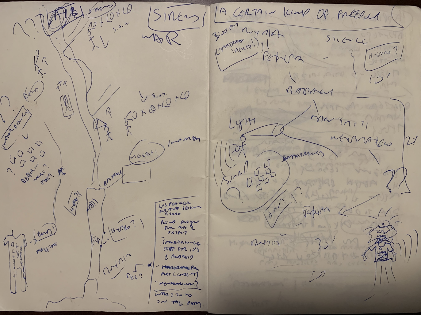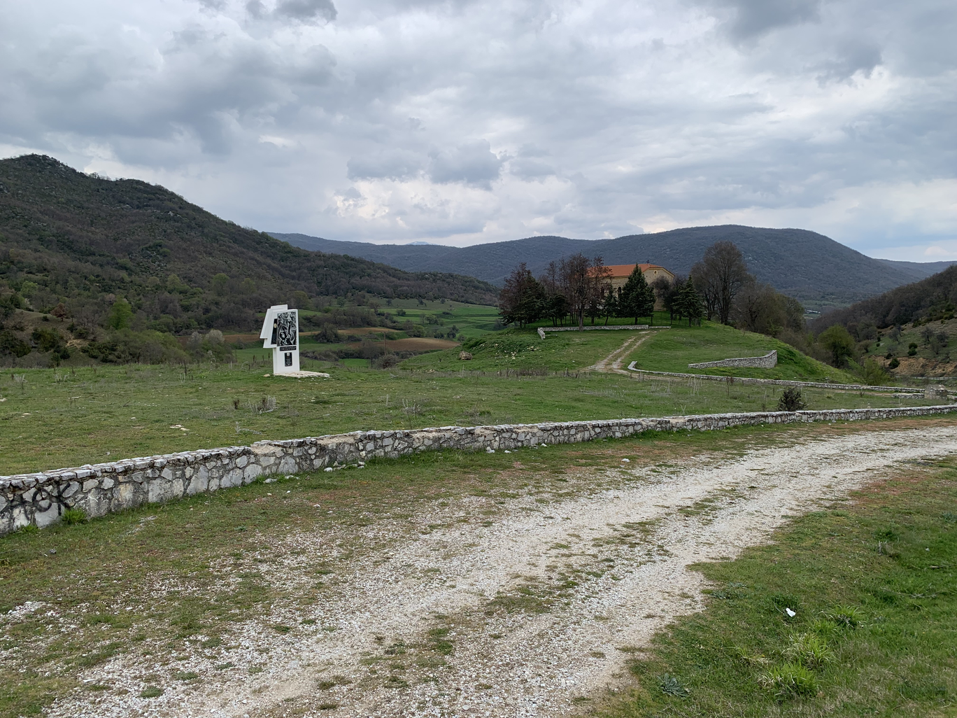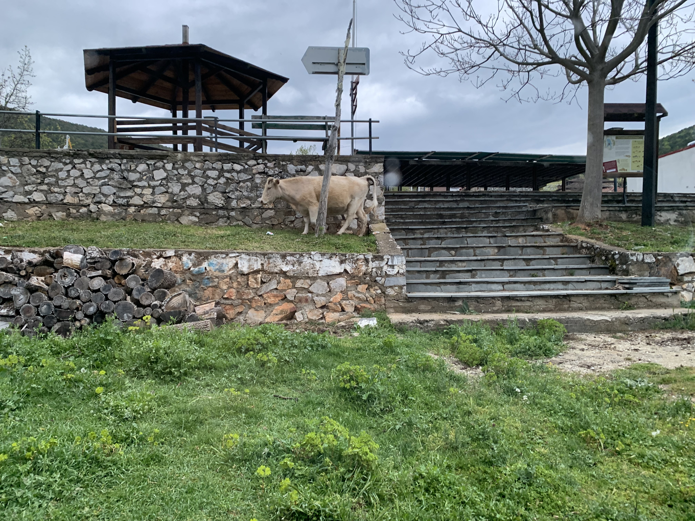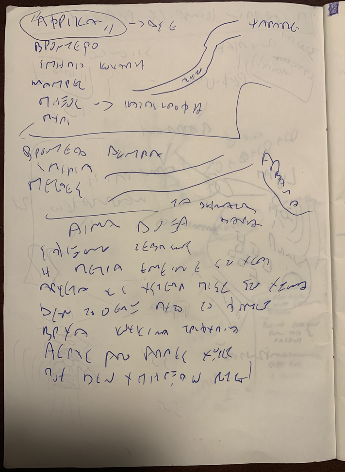 The author visited the area several months before the scheduled performance to explore the landscape and investigate possibilities. He walked, drifted, and visited several different locations in the broader area, including forests, towns, monuments, the cave that hosted the DSE hospital during the last phase of the Civil War, the house of the General Secretary of KKE during the last phases of the Civil War (see Historical Background), several spots by the lakes, and other places. He then drifted the Great Prespa Lake by boat and visited the exact location where the three sovereign countries (Albania, Greece, North Macedonia) meet while recording underwater sounds and surveying the birds of the lake. He talked with locals, conducted radio recordings, kept notes and sketched poetry. This trip provided the author with ample information as well as a very concrete experience of being-in-the-field; the importance of the latter in general and in the author’s work in particular is discussed in (Koutsomichalis 2022). Below are extracts from the author’s notebook, and there are photos from this expedition both above and below.