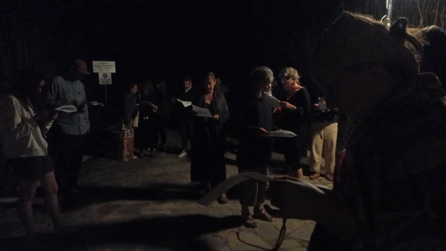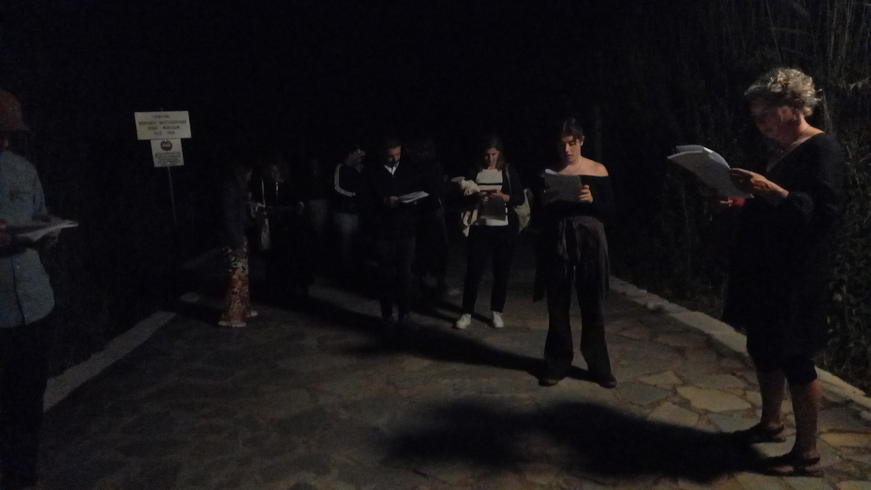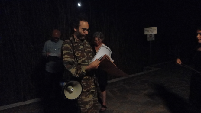 Of course, as is very often the case, the performance that is eventually staged was expected to deviate from the draft plan above. As a rule of thumb, the author only finalizes peripatetic works of that kind on-location and immediately prior to their performance, as places are contingent and, much more often than not, appear to him different in significant and unpredictable ways at later times. Still, the above were the premises when the author visited the region again a few days prior to the public performance to work out the details. Some differences were immediately evident: there was no choir of birds that time of the year; a nearby restaurant broke the silence and the darkness up until around midnight; it was not logistically possible to install the hydrophone/loudspeaker rig. The Performance section bellow presents the finalized composition in more detail.