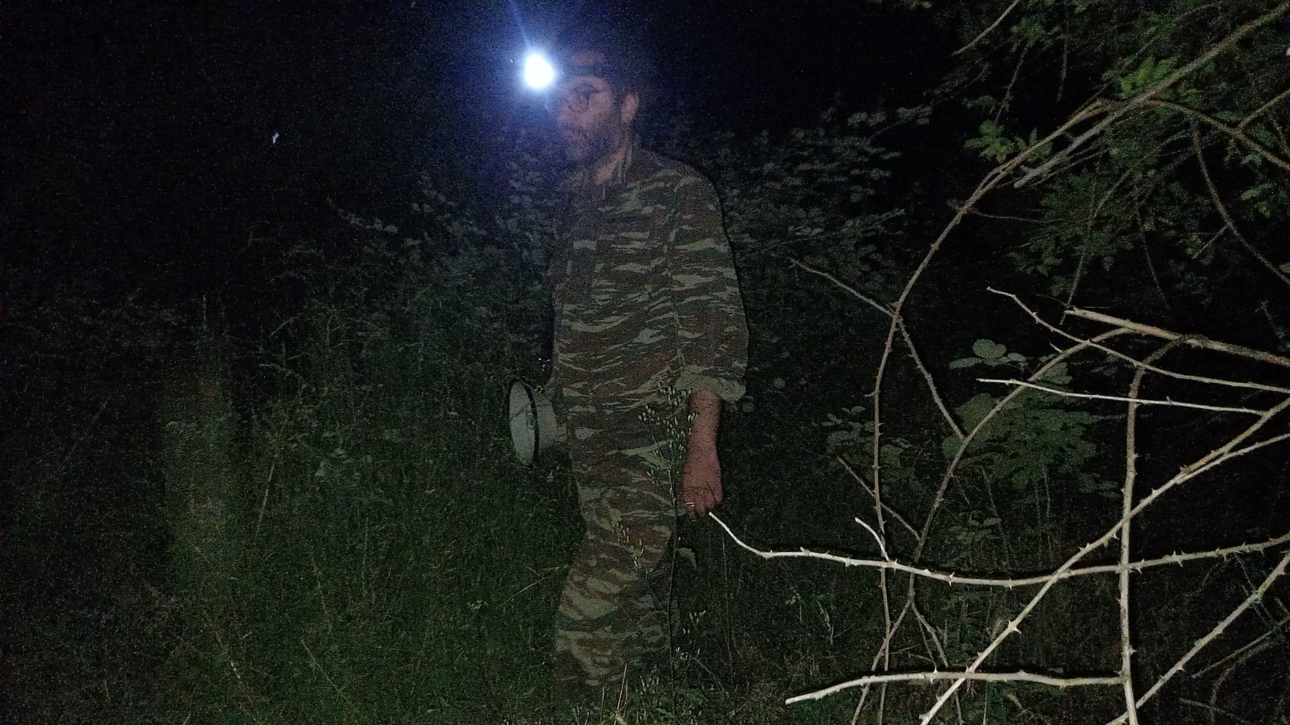 Towards the Basilica [~5']: Once on the Ag. Achillios island the author leads the audience off the main route, thus leaving the few homes of the village behind, passing by the cemetery, and entering the nearby bush. The author leads the audience through the bush towards the ruins of the Basilica of St. Achillius (10th c. BCE); the only light is from the torch the author wears on his head.