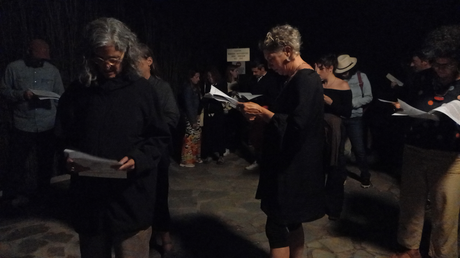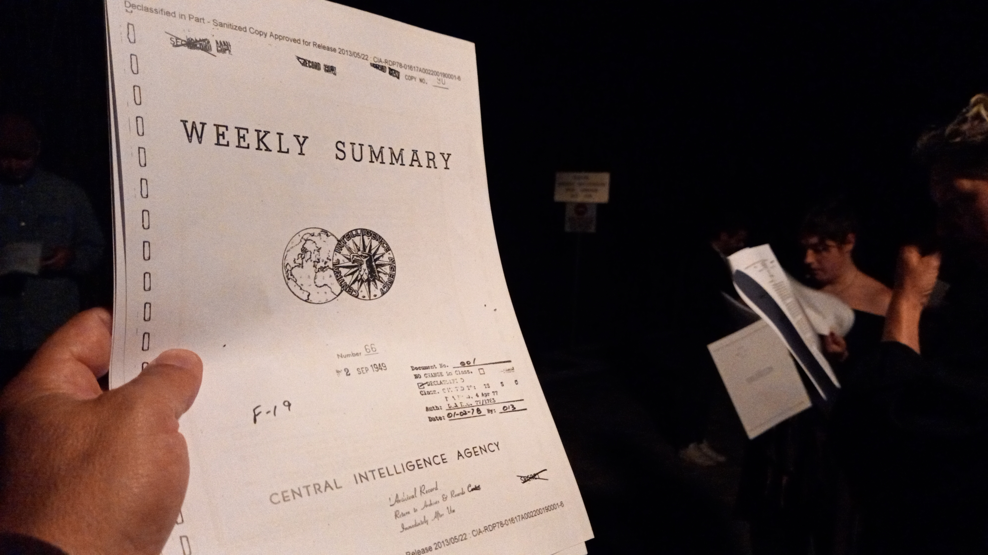 Sharing the CIA records with the audience is an apparatus that serves several compositional purposes at once. On a poetical level, it operates as a decompression buffer zone: the performance fades out into an informal ending but the audience is still pretty much engaged with the key aspects of the work. Beside the reeds at the side of the lake and against the sounds of the frogs in the background, the audience is still given pieces of information about the history of the place and enjoys an opportunity to talk with one another or with the author about the experience they have just lived. Then, the CIA records immediately delineate political controversies and historical bewilderedness.