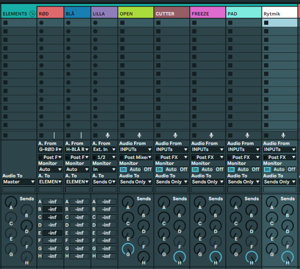 These are then routed to return channel G and H to be able to separate the dry and wet signal in two "banks" of Rød and Blå (red and blue). They can further be processed on group level for e.g. a tremolo effect on only all the wet effected signals conjunctively. Lilla (purple) is the return of my external pedal effect loop, which can receive from the input group or other groups, as well as introducing a partial feedback loop by re-routing it back into the input group.