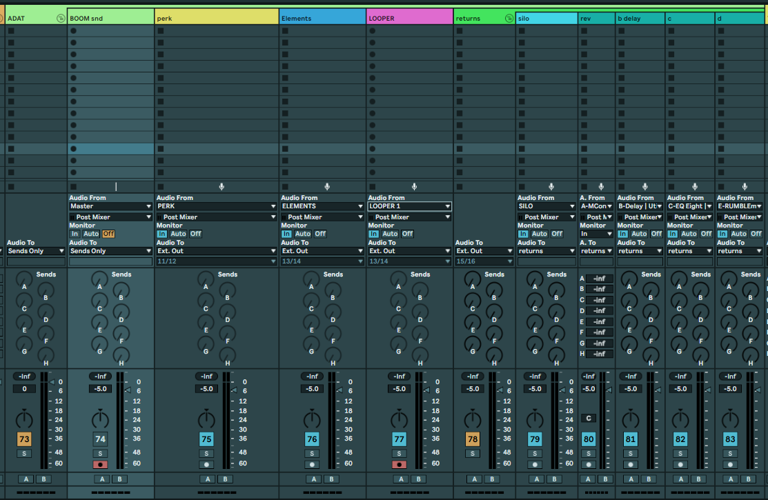 In the screenshot below, you can see the Ableton routing of different sources and the return channel group to outputs corresponding to my ADAT virtual channels (11/12, 13/14, 15/16)