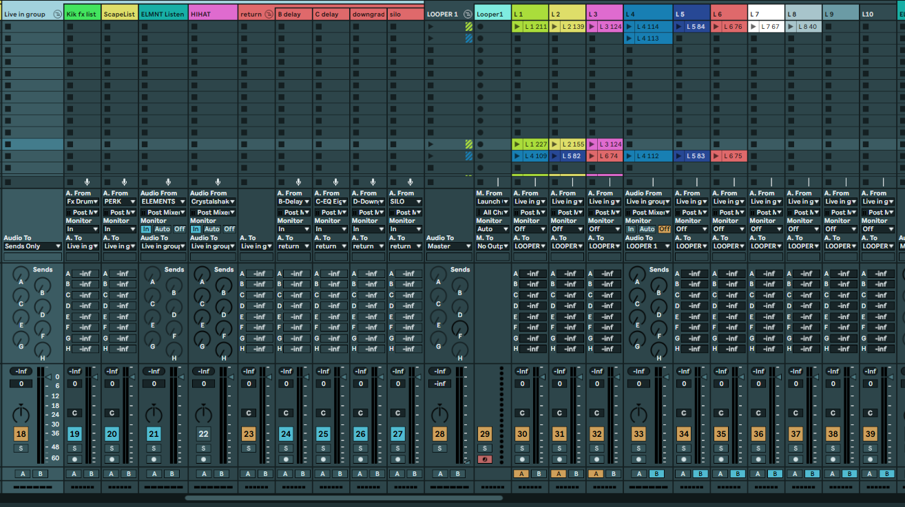 Notice the A and B crossfader designations of the Looper group's track layers (L1, L2, L3, ...) enabling gradual morphing between chronological layers of loops. In this way, I can return to the origin of the initial musical idea (A postition) or remove the starting points and only focus on the last additions of layers (position B).