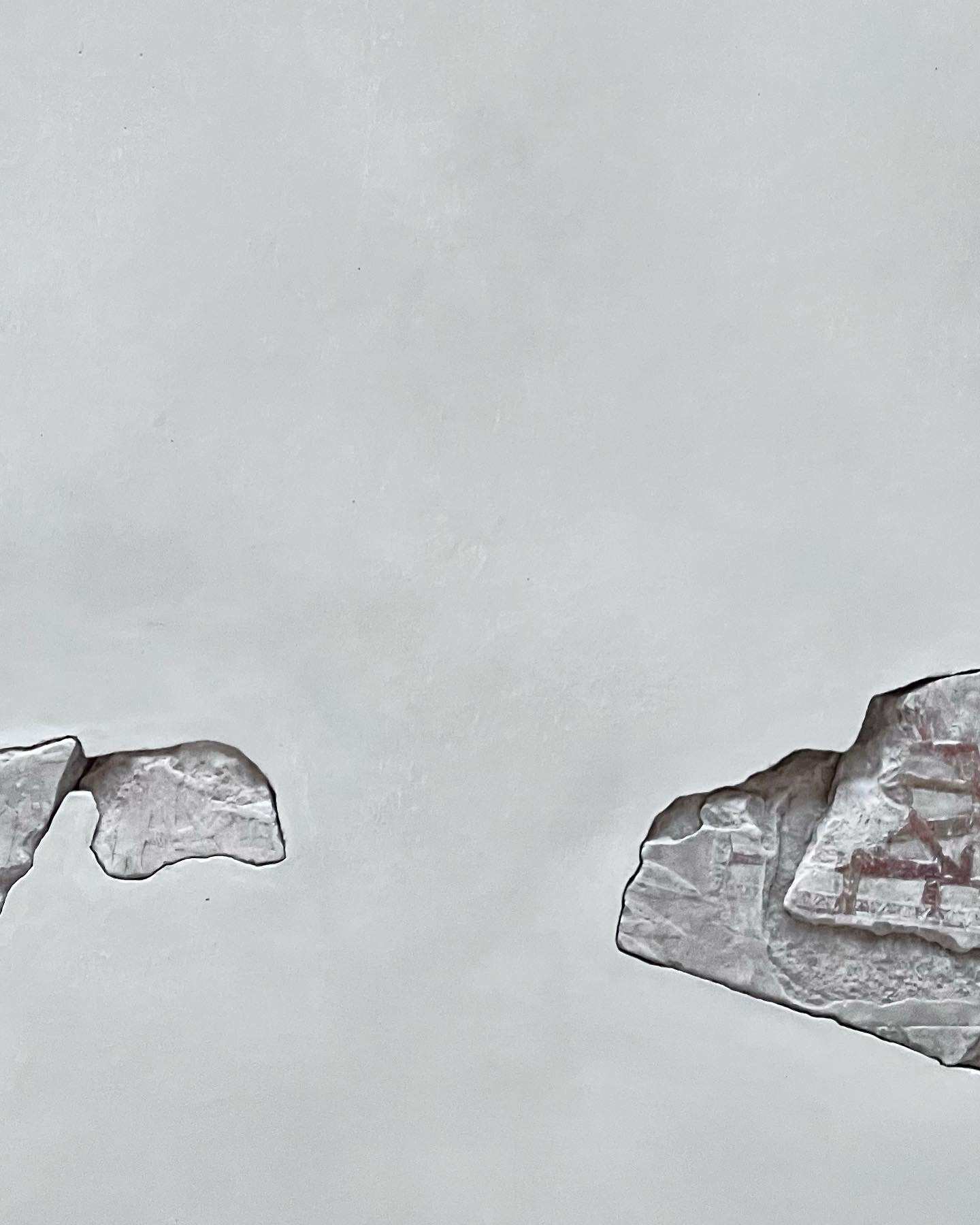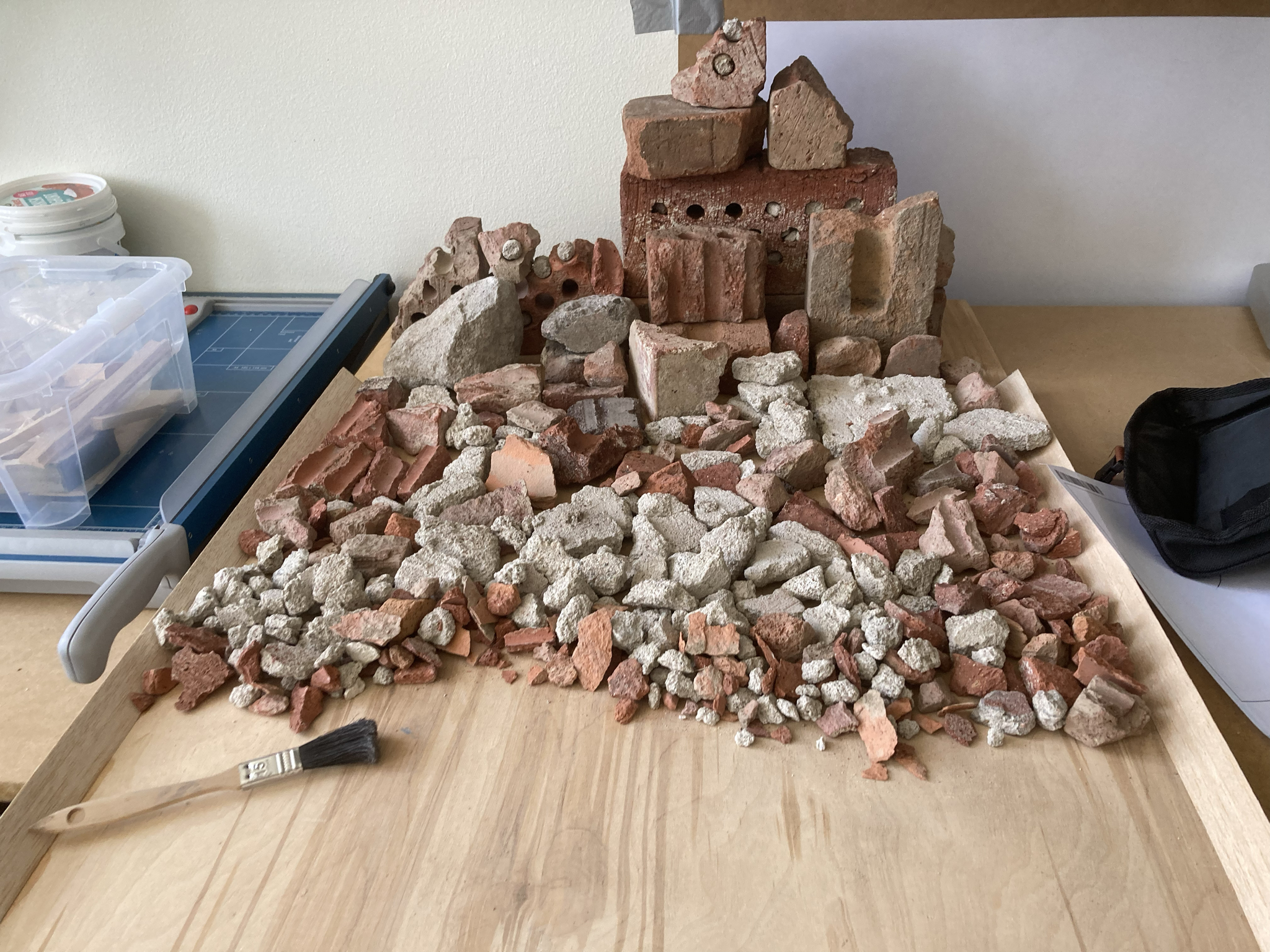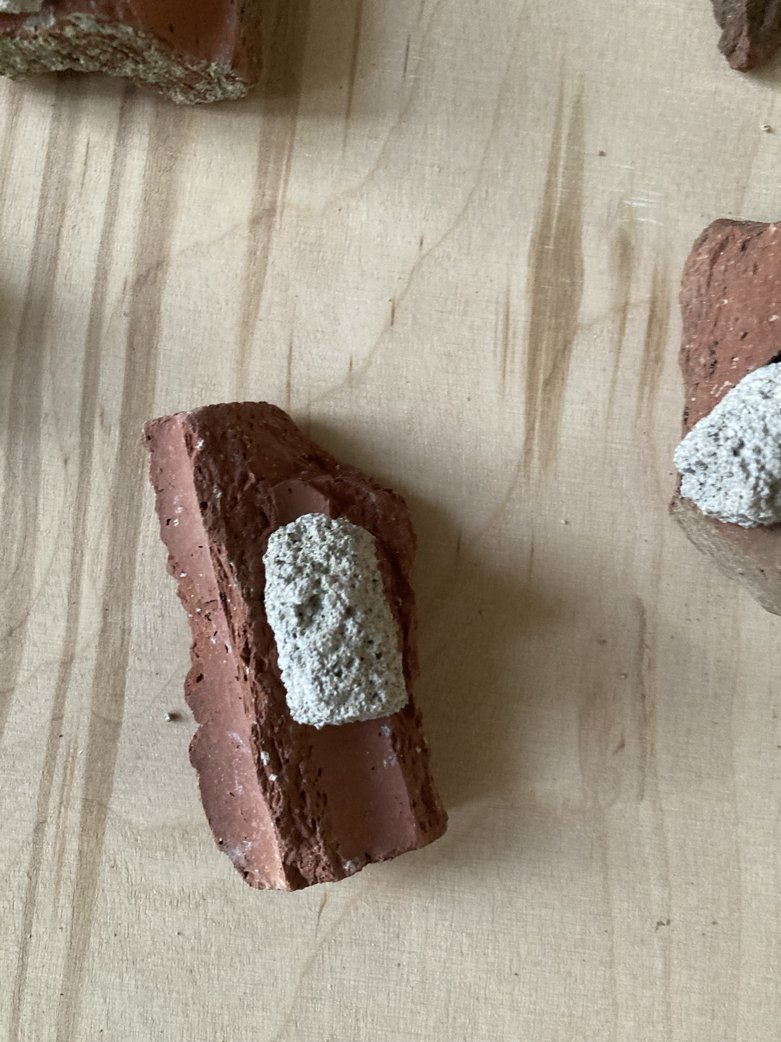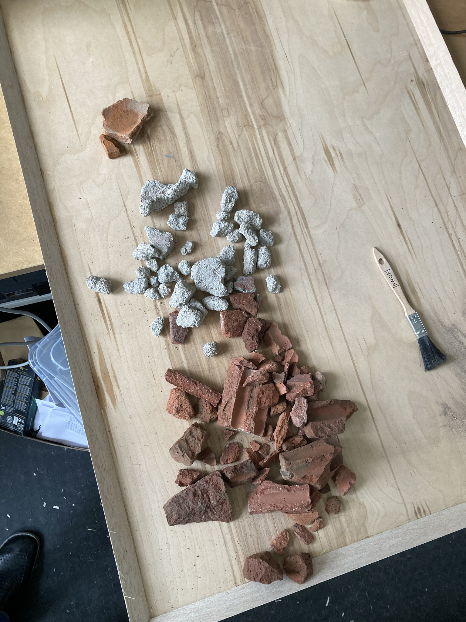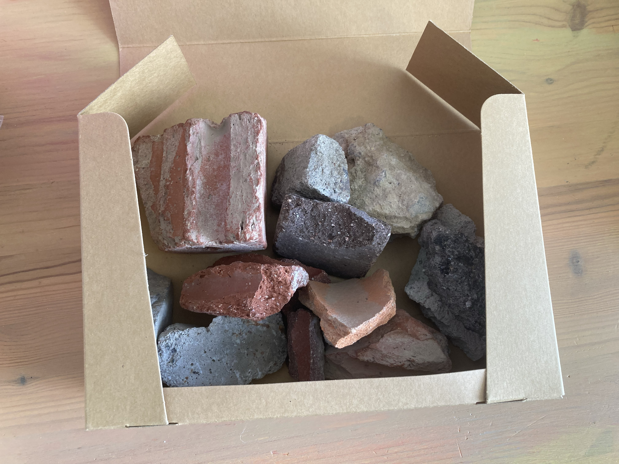 Konstnärens egna insamling av stenar funna på skolgården på Slättgårdsskolan som är delar av den nedbrunna och rivna skolbyggnaden. Stenarna samlades in under förstudiefasen och utgjorde ett arbetsmaterial som sedan användes i presentationer samt i förankrings- och ansökningsarbetet.