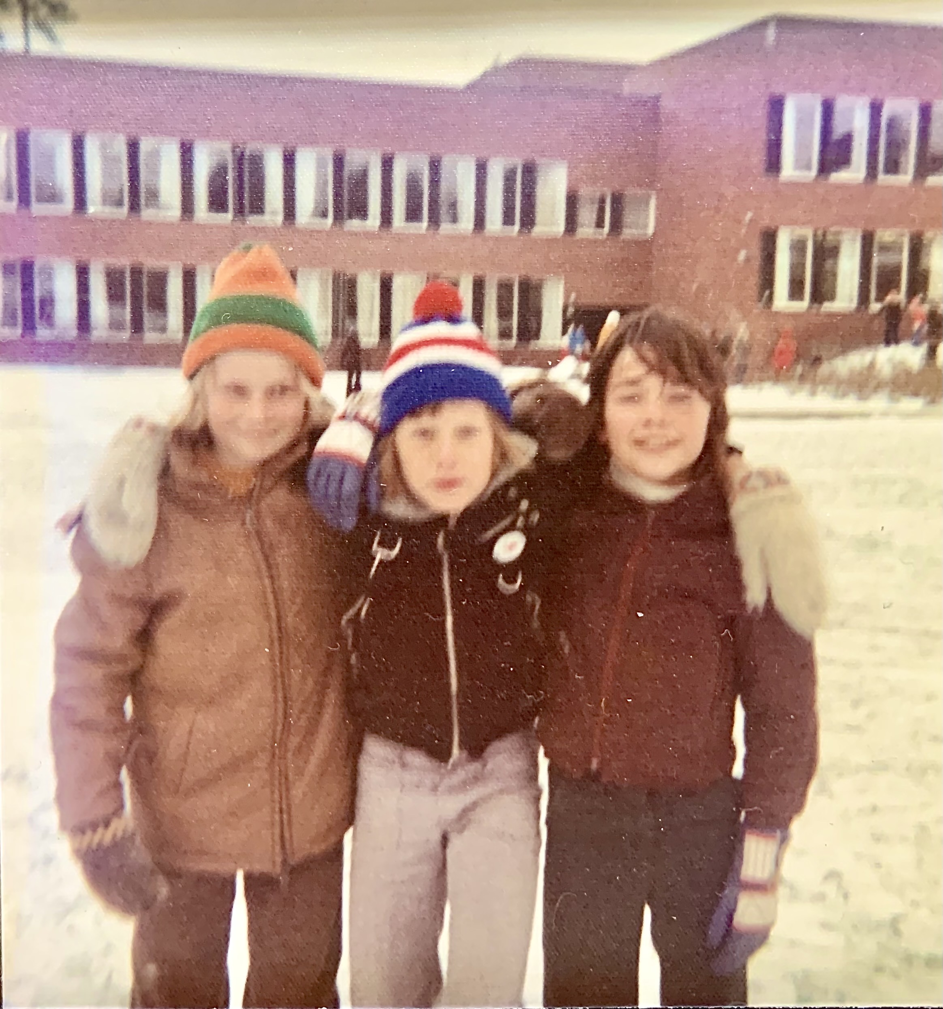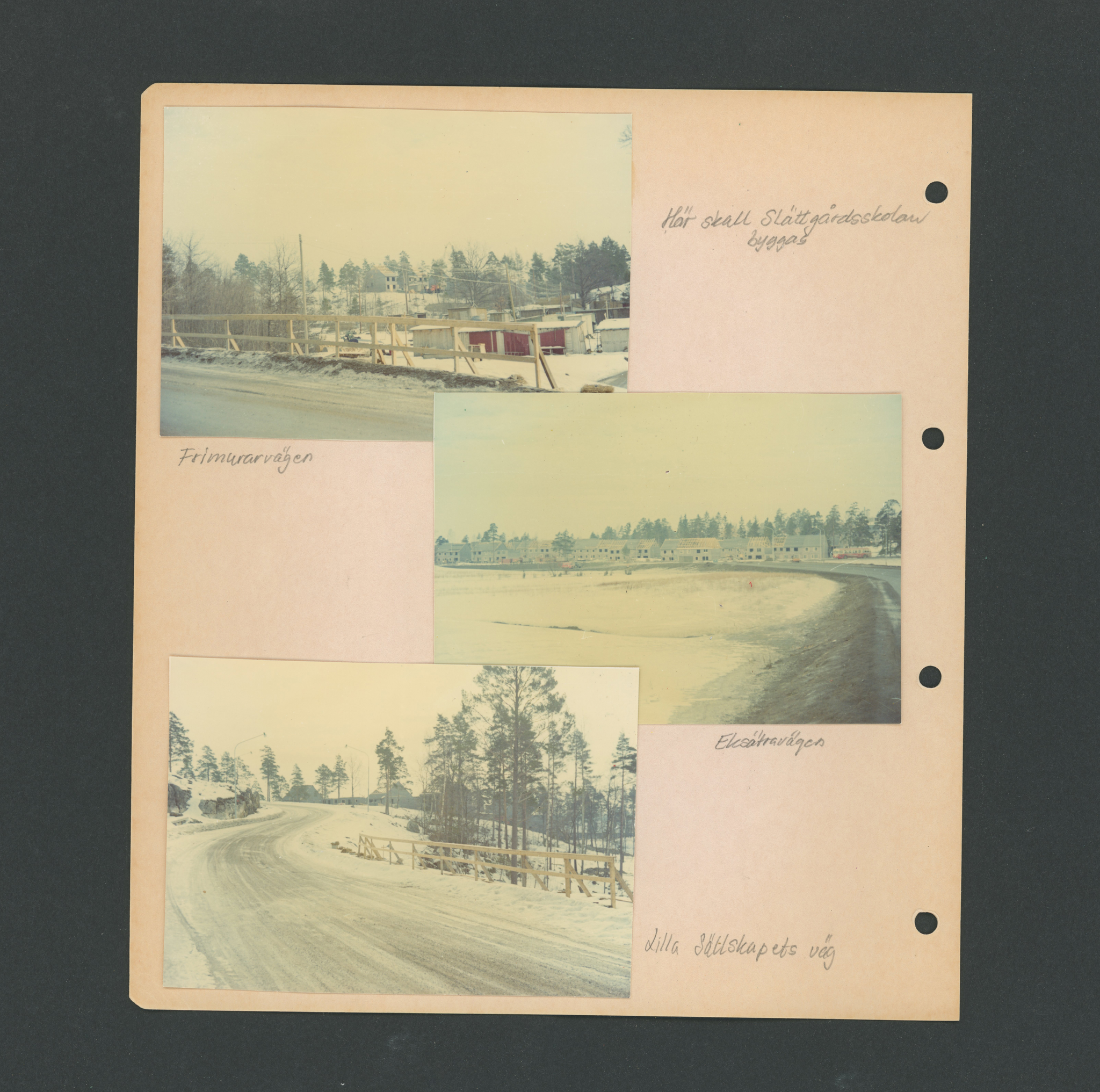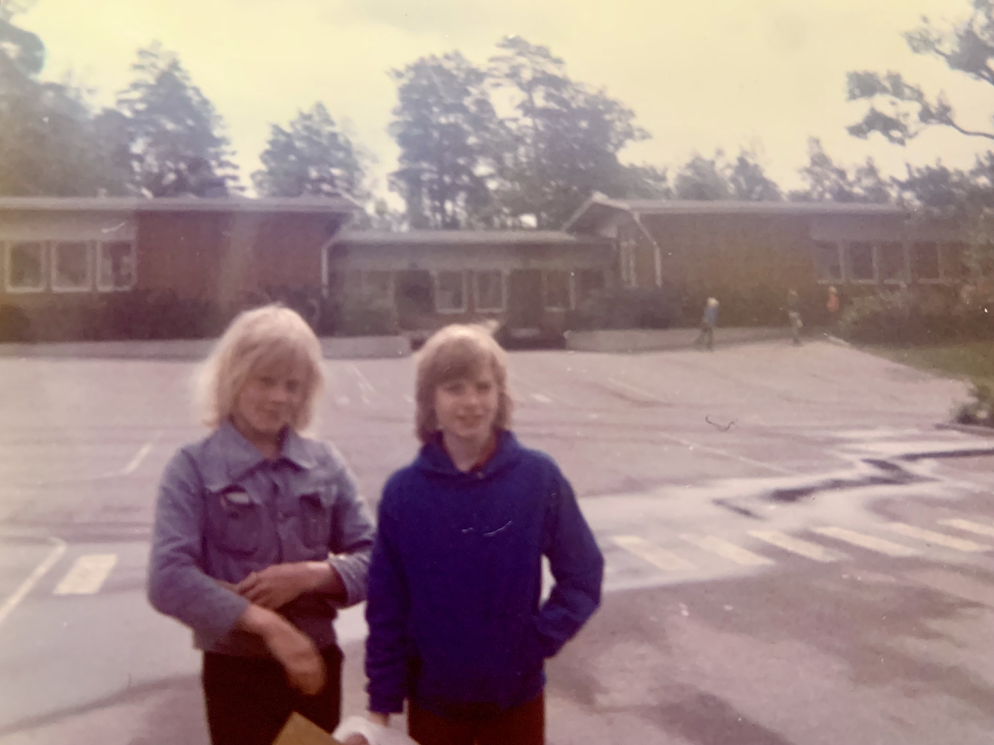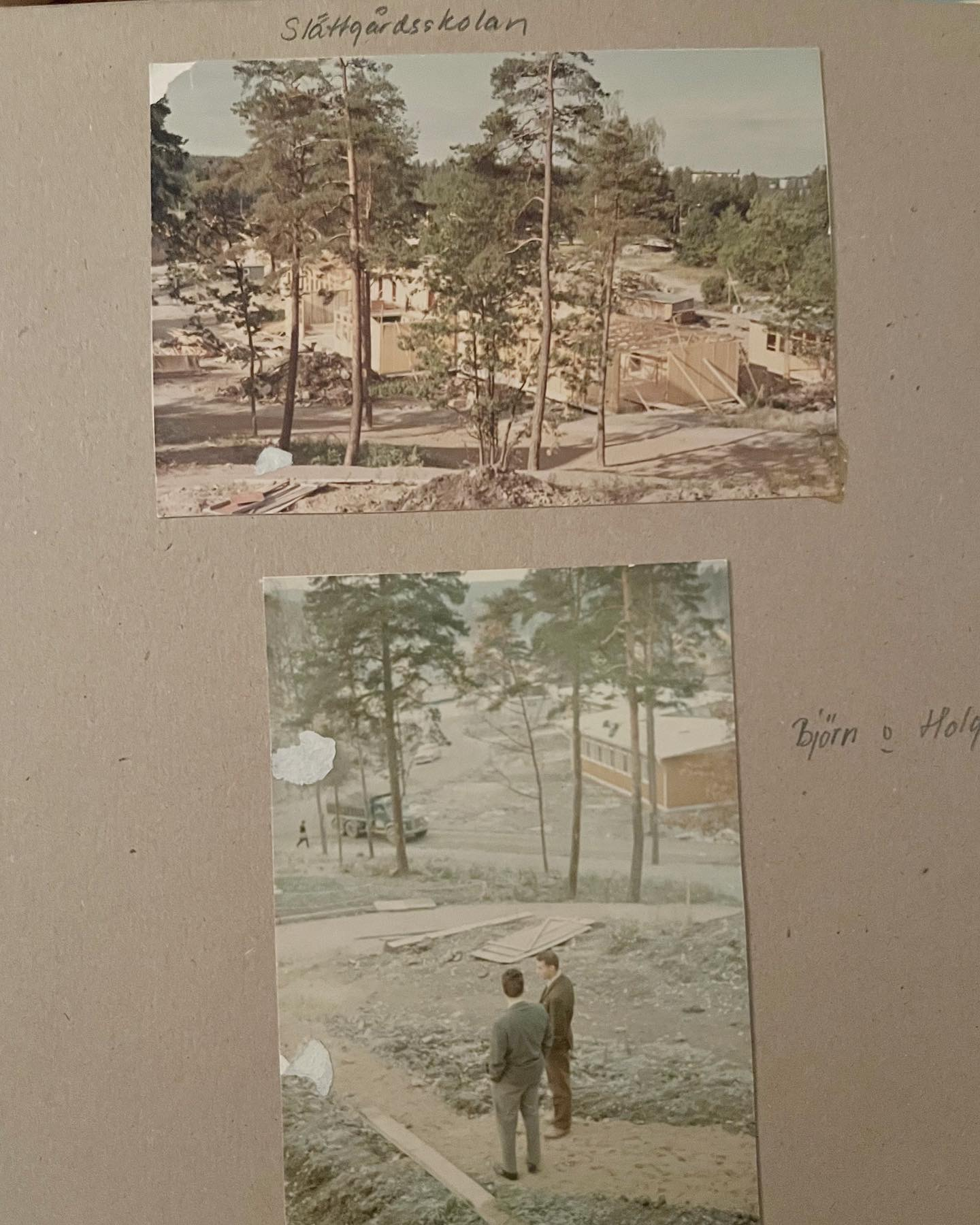 Anette Anger, som varit granne med skolan sedan den byggdes. Hennes bilder kommer från byggåren 1967-1968. Familjen följde nyfiket bygget som pågick strax nedanför deras radhus på Lilla Sällskapets Väg, och deras barn började sedan på den då nybyggda skolan. Anette berättade hur barnen kunde åka pulka ner till skolan på vintern via den sluttning som vette ner mot skolgården.
