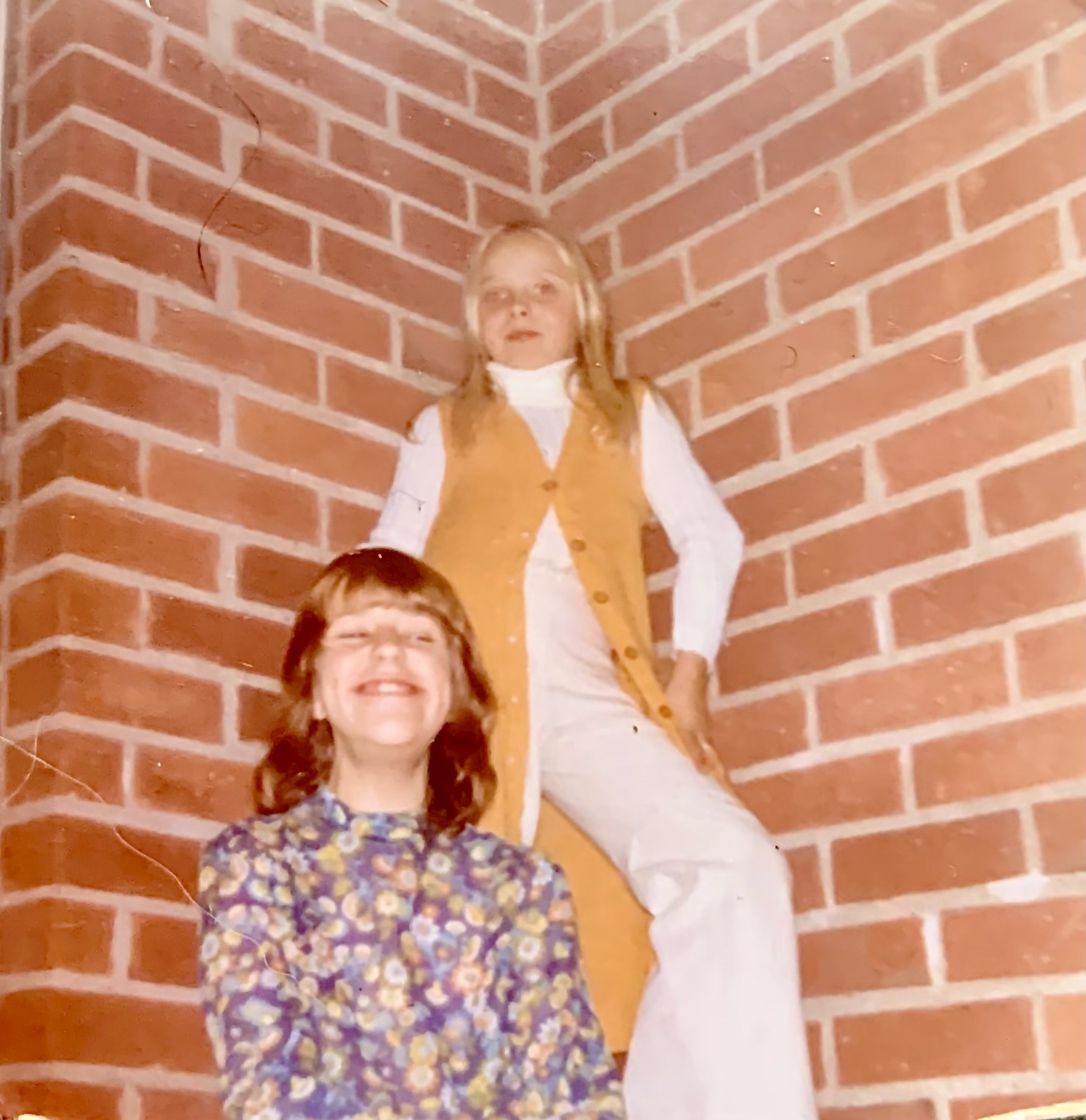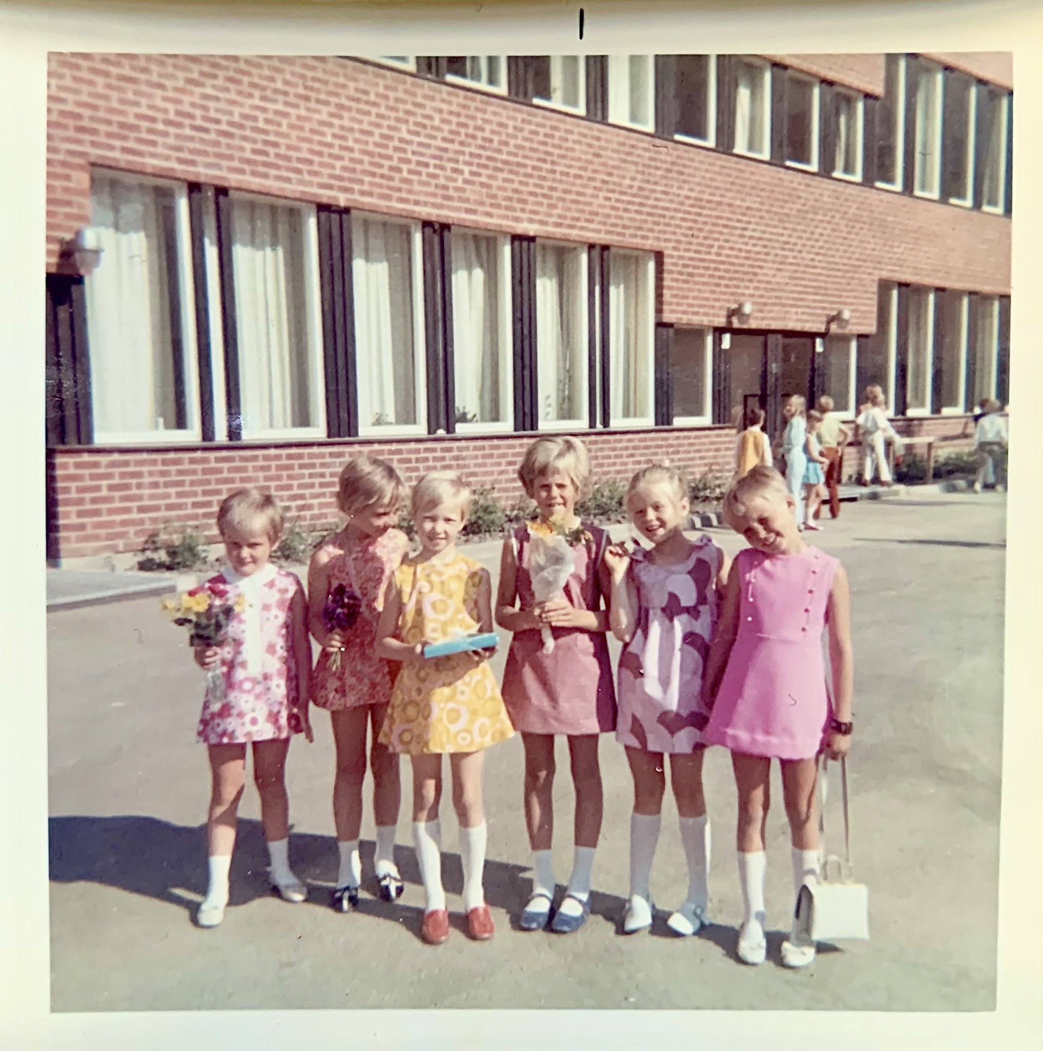 Anette ”Nettan” Elghorn gick på Slättgårdsskolan 1968-1974 och har letat igenom två flyttkartonger för att finna dessa fotografier. Bilden till vänster är från skolavslutningen 1969 i 2B, och från vänster räknat står Carina Ekman, Irene Engström, Annika Wernerson, Monika Andersson, Kristina Nitzler och så Anette Elghorn. Hon kom på utställningen och träffade flera av de nuvarande eleverna, och de talade om hur skolan var nu och då.