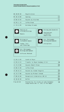 Writing is often equated with the discursive. But what about the cursive, the spacial, the temporal, and the audible aspects of writing? Writing and speech, like art works, are performative. In the context of artistic research hybrid forms like graphic design, illustration, script writing, voice-overs, drawing vignettes and the artist’s book testify that the opposition between art practice and writing cannot be maintained. But in what dialect, tongue, idiom or language do we voice our understanding and experience? Is collaboration between different voices and registers key here? What does publishing mean in this context? And how does the tacit knowledge of the body and our subjective experiences translate to more explicit modes of discourse and dialogue?