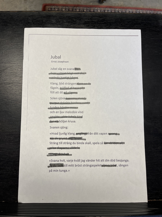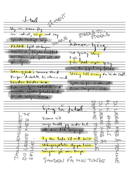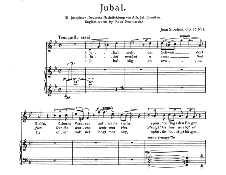 Jubal såg en svana fly, över vattnet högt mot sky, spände hastigt bågen. Klang, ljöd strängen. Som en il, fågeln, träffad af en pil, föll att dö på vågen.2
