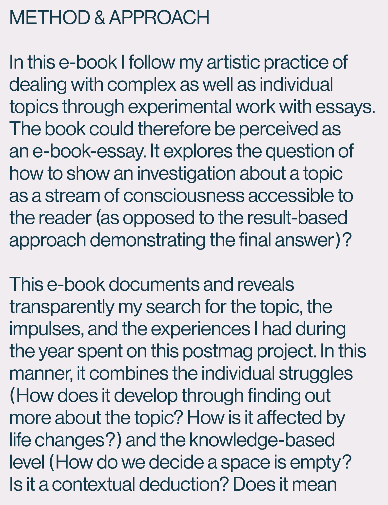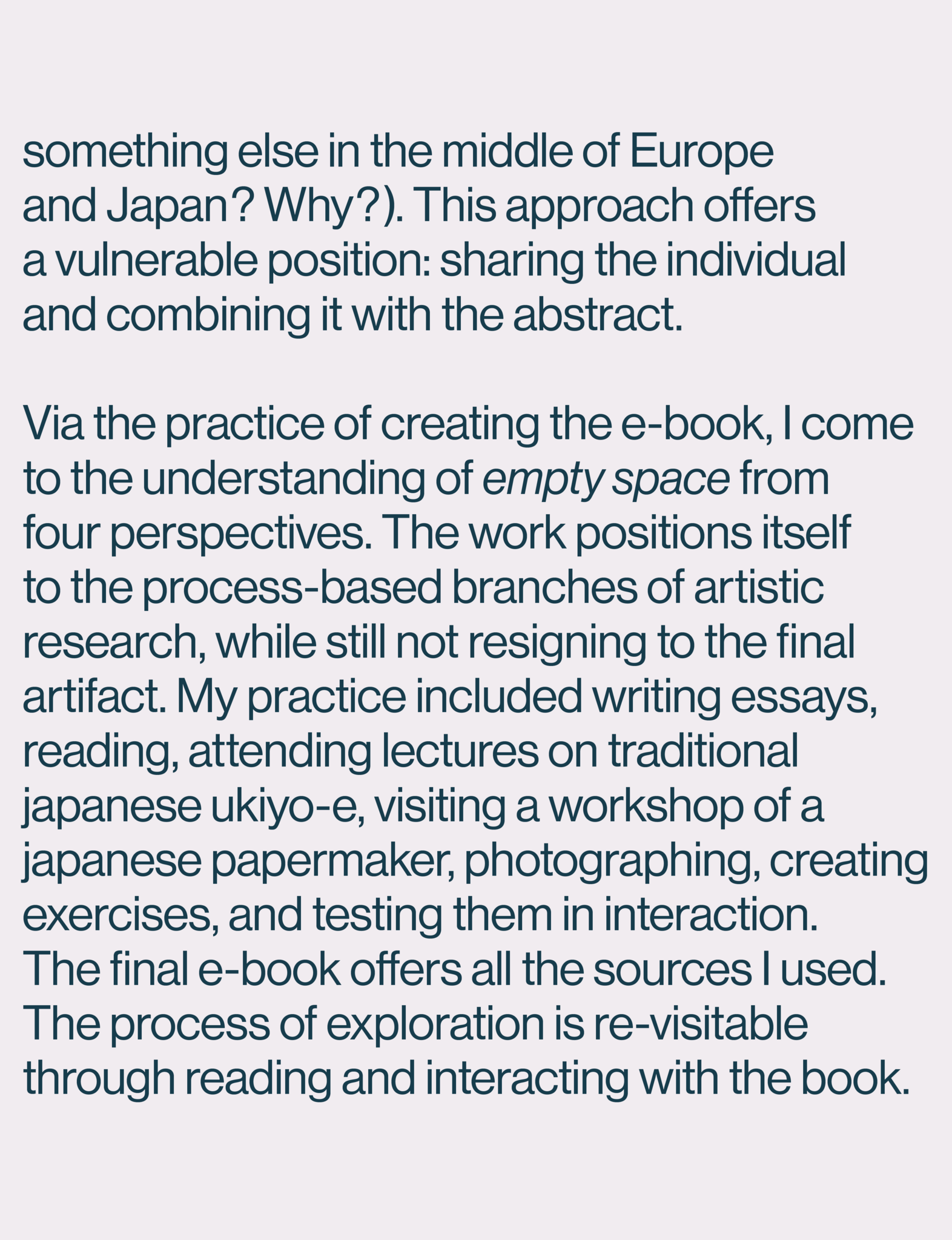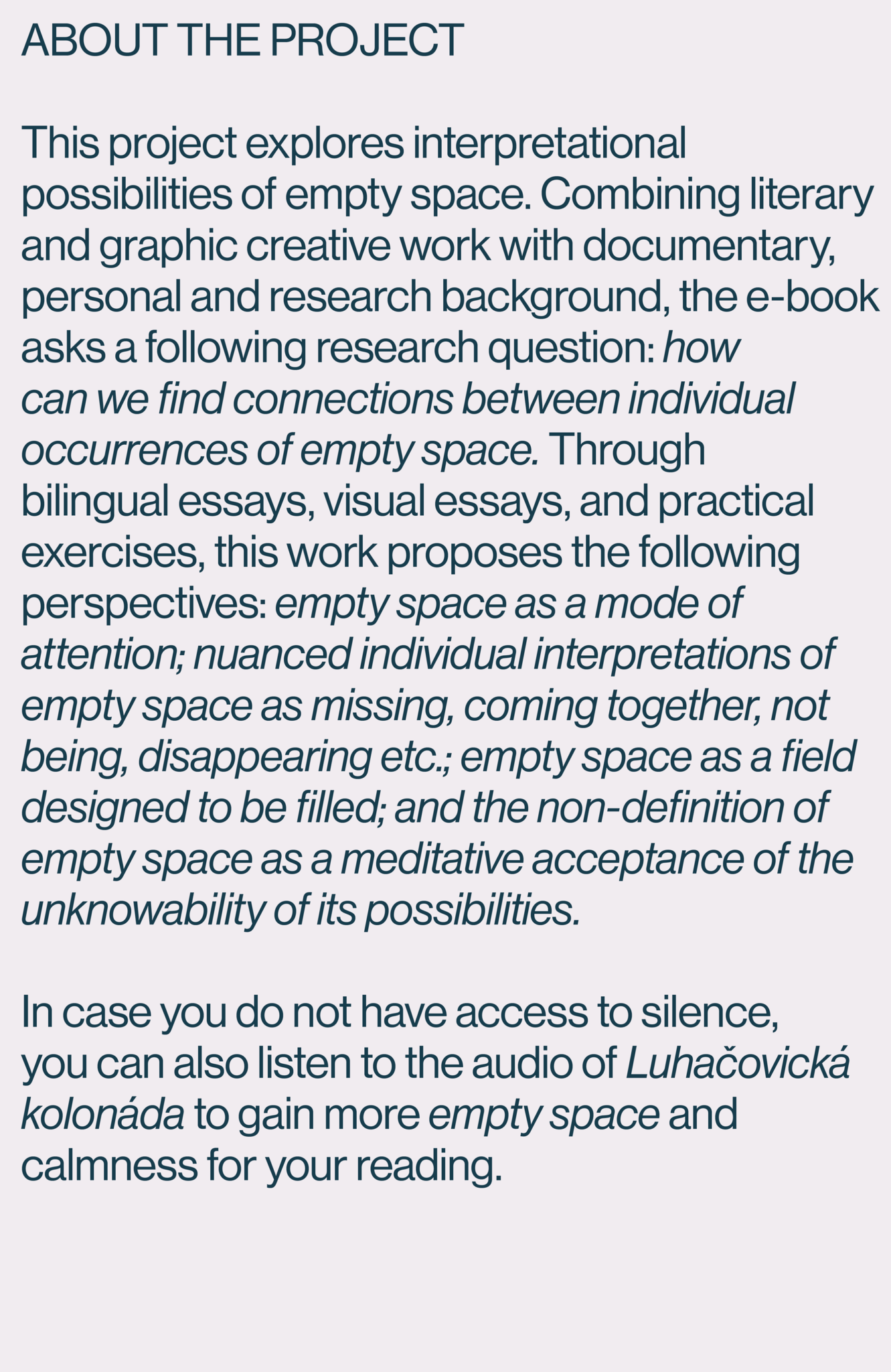 This artistic post-master research explores interpretational possibilities of empty space. Combining literary and graphic creative work with documentary, personal and research background, the e-book asks a question how can we find connections between individual occurrences of empty space. Through bilingual essays, visual essays, and practical exercises, this work proposes the following perspectives: empty space as a mode of attention; nuanced individual interpretations of empty space as missing, coming together, not being, disappearing; empty space as a field designed to be filled; and the non-definition of empty space as accepting the unknowability of its possibilities.