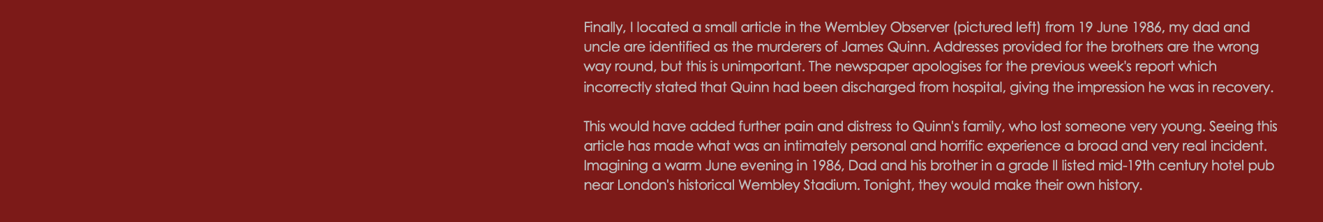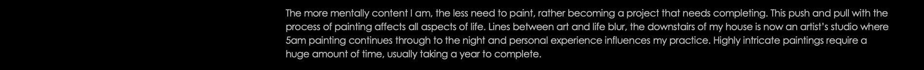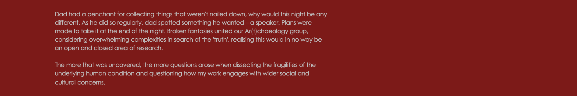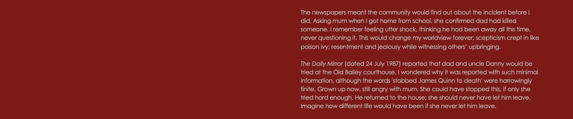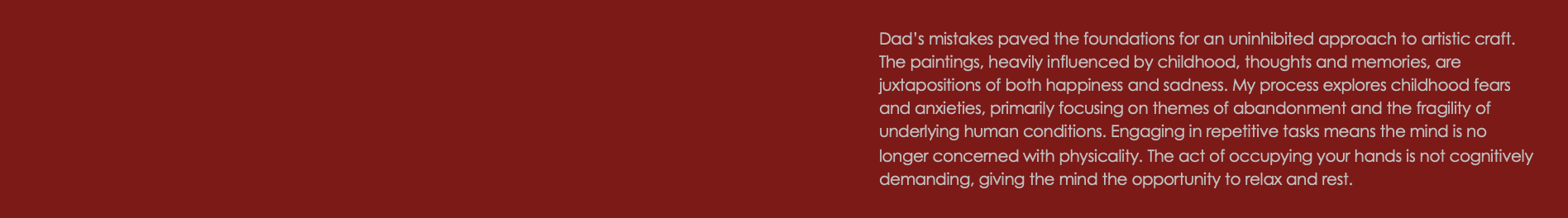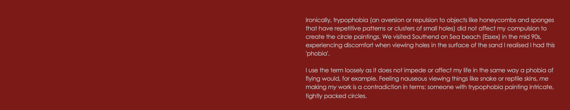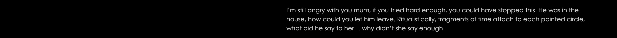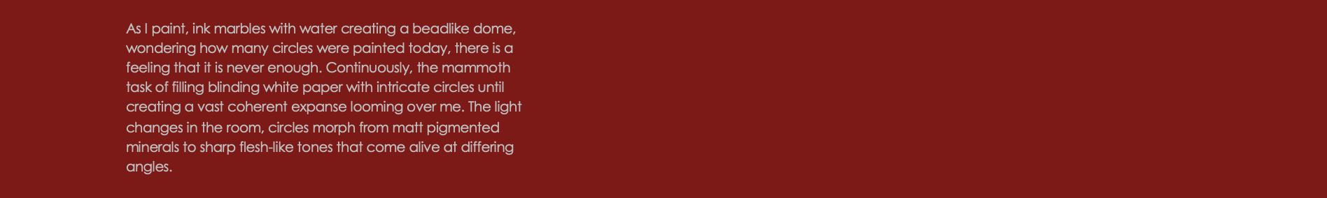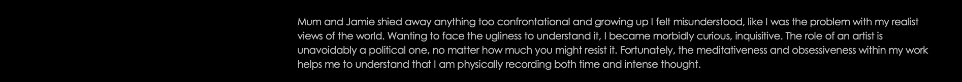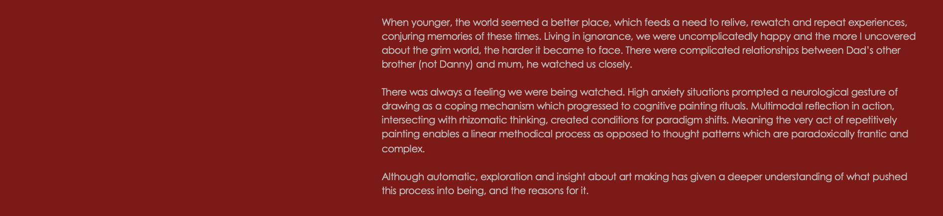 Why I paint Thousands of Circles explores psychological barriers and multilayered themes that stem from a single horrific event that involved Moran’s father and his brother. The artist collates information, photos and constructs an ar(t)chaeological archive where family photos, product imagery, together with newspaper clips to form units of a historical and psychological mind map. The exposition becomes an auto-ethnographical exploration of mid 90's working class North West London. The repetitive painting process, exposed and documented in the exposition, functions as transformative method, where ambiguous feelings of a violent upbringing are directed towards the creation of a visual system with an inherent logic – “creating some kind of beauty out of ugliness.”