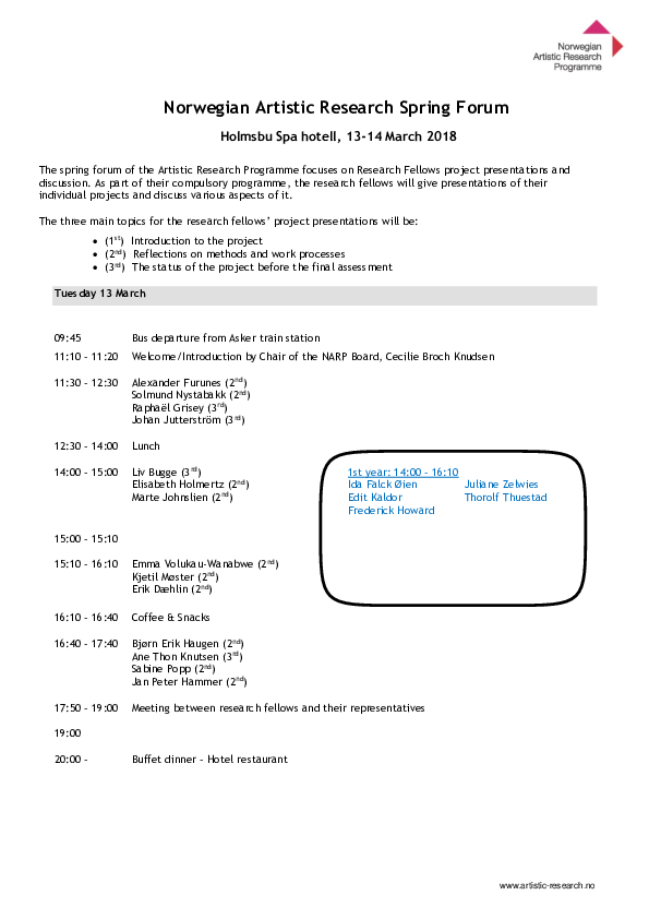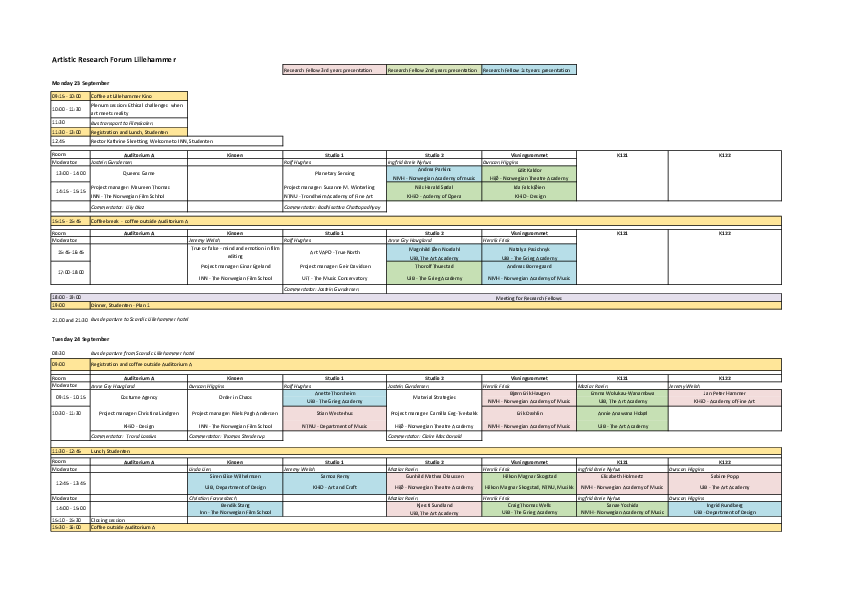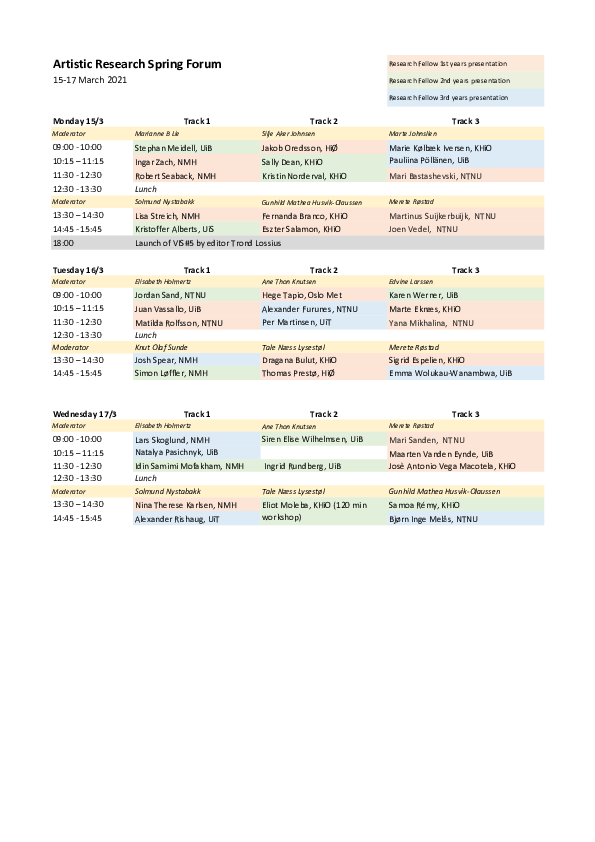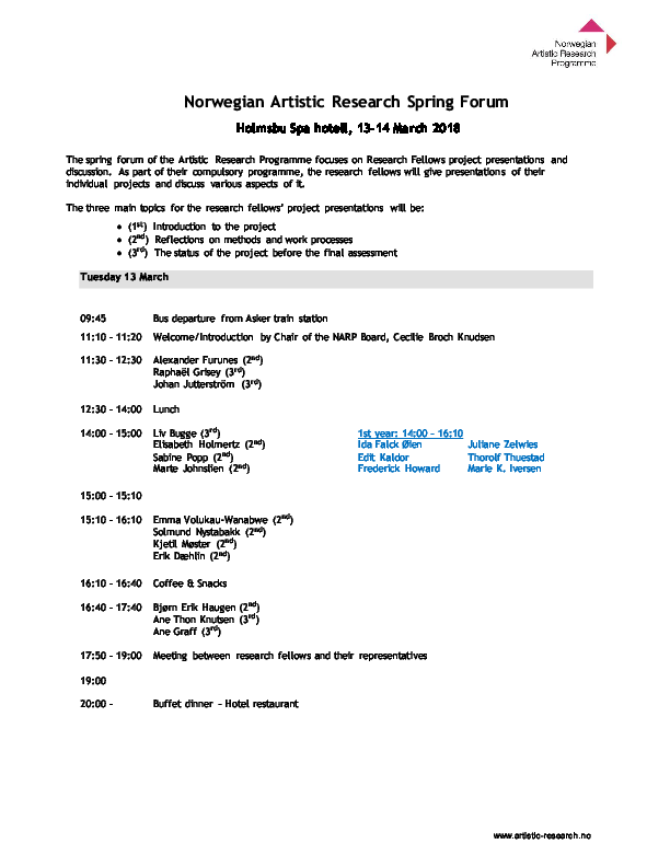 Artistic Research Spring Forum 2023 took place in Oslo at the Norwegian Film School (Inland Norway University of Applied Sceinces) and digitally. 2 project leaders and 28 fellows did present their projects. VIS - Nordic Journal of Artistic Research released #9 Of memory and public space. A draft of guidelines for atistic research ethics was presented in a streamed session.