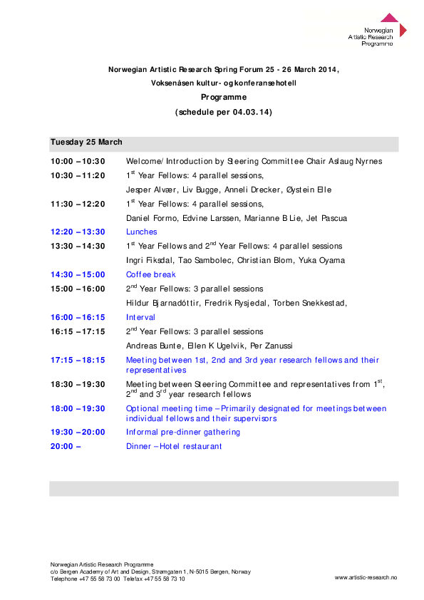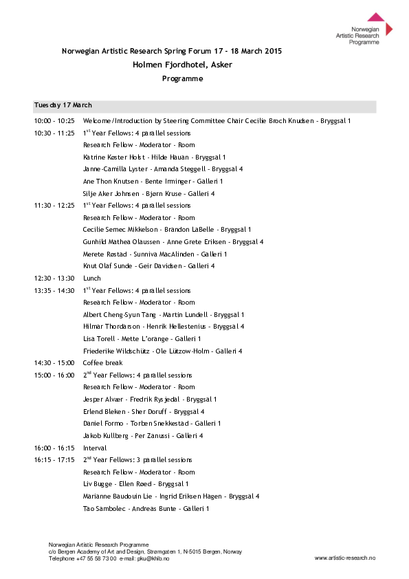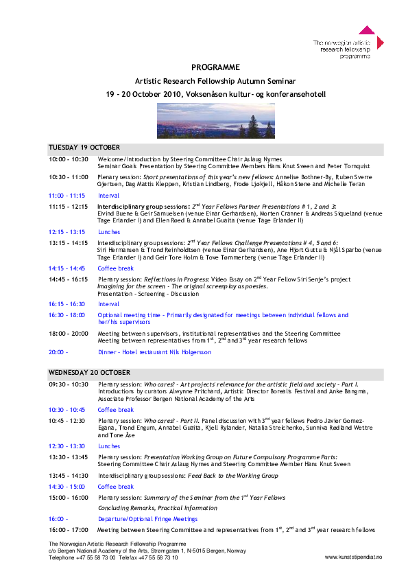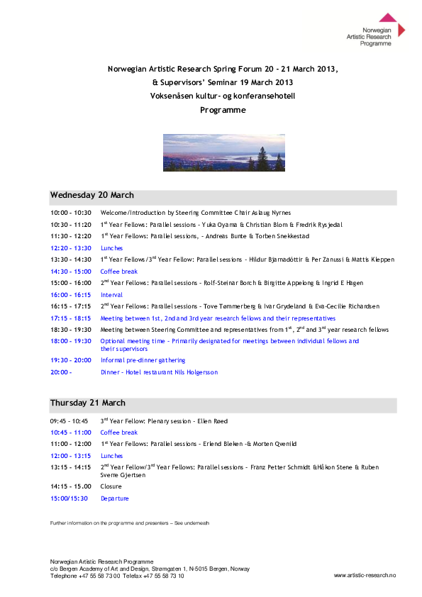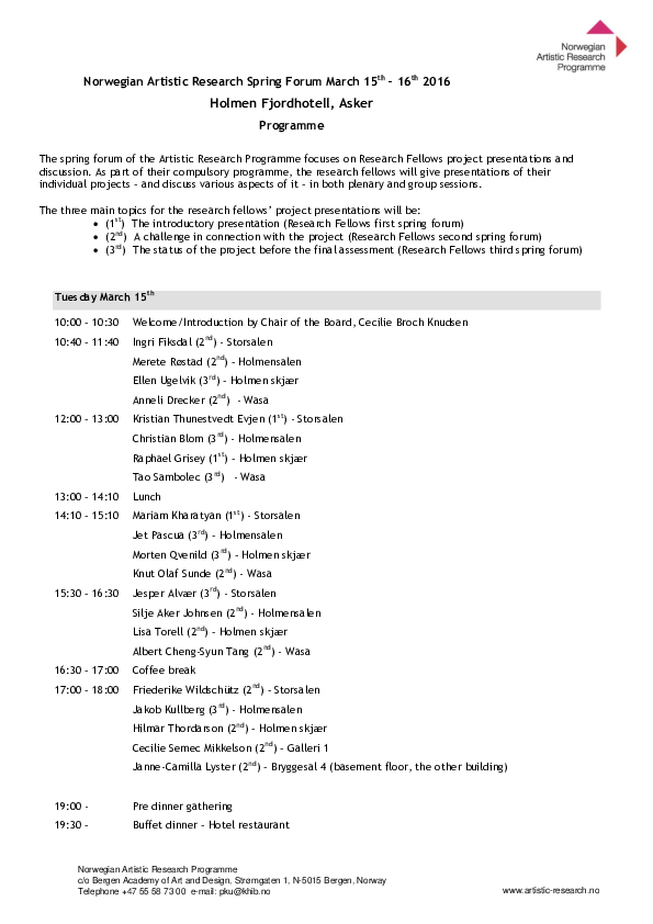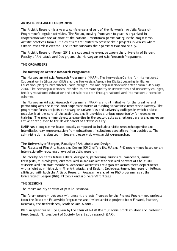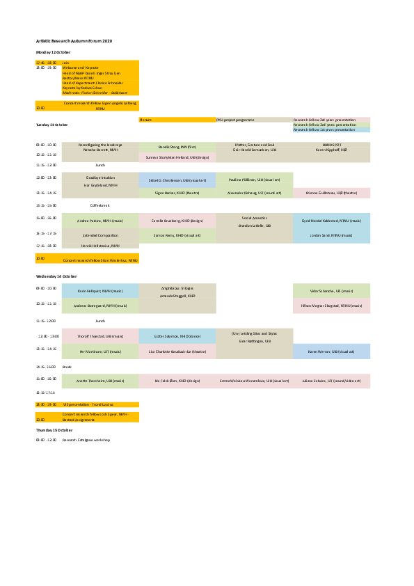 Artistic Research Autumn Forum 2025 took place in Bergen 20-22 October and online 24 October. The forum was hosted by the Facultu of Fine Art, Music and Design, University of Bergen. ARF included 39 PhD project presentations, 1 project programme presentation, two panel debates, a VIS launche, and a social event.