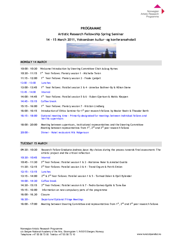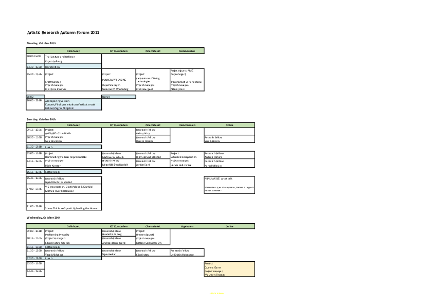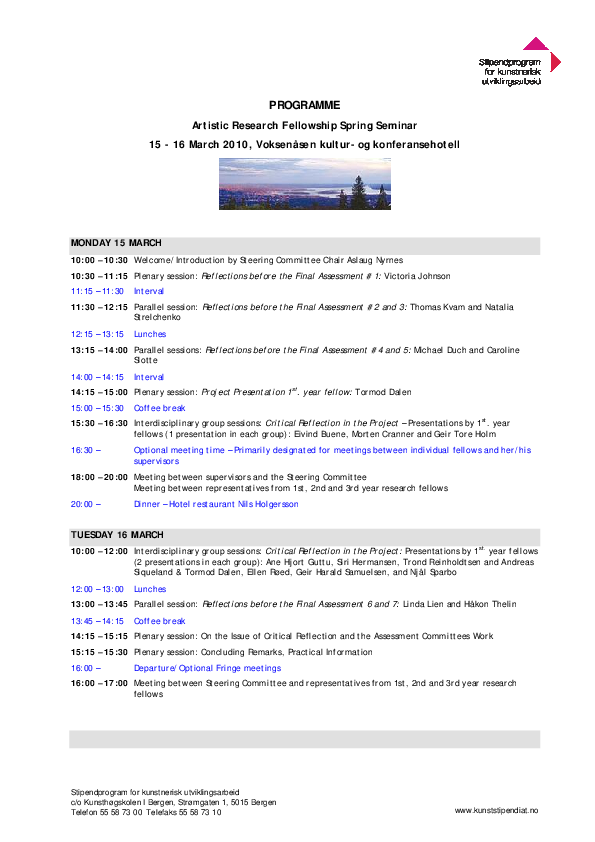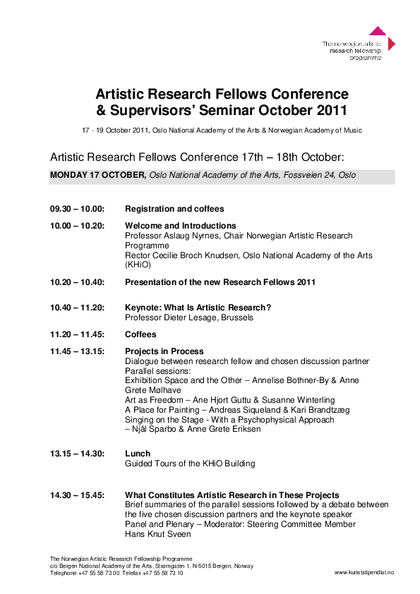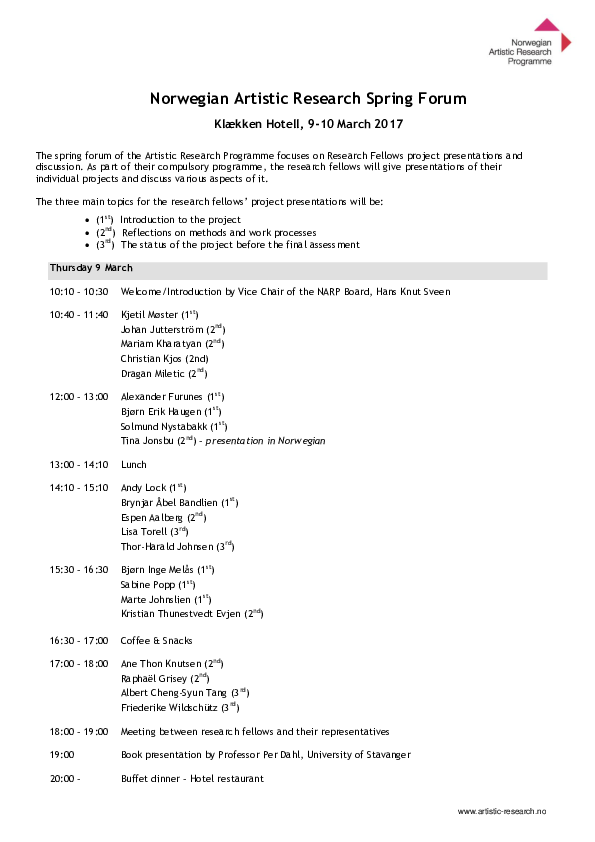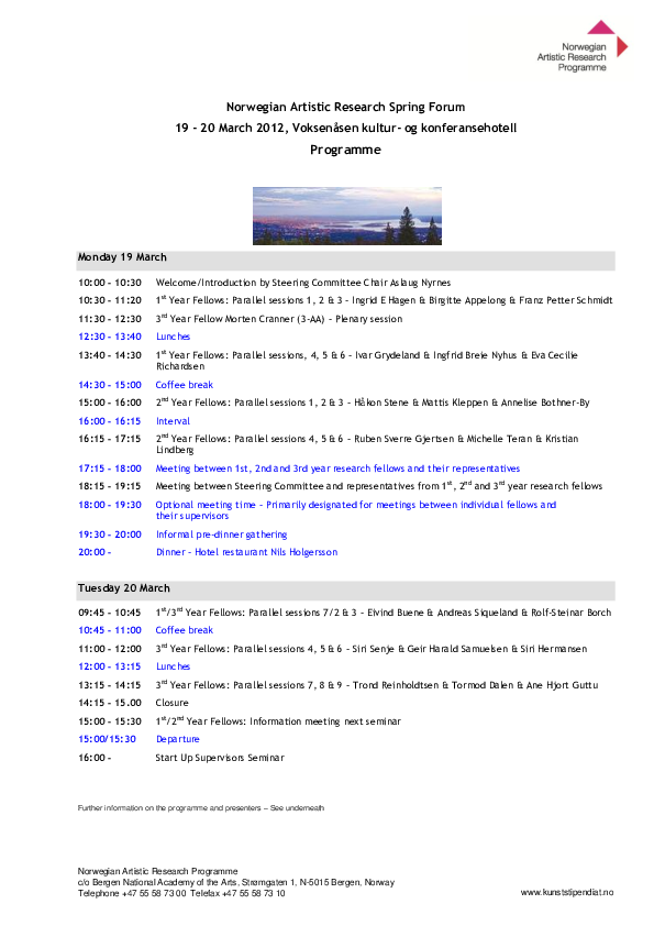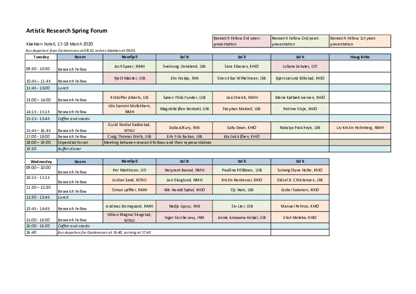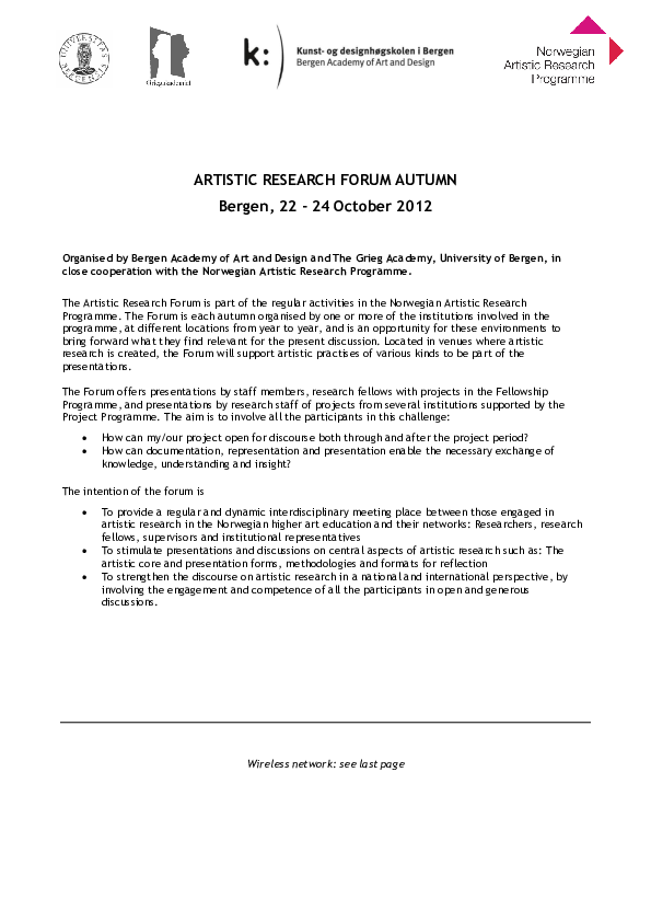 Artistic Research Autumn Forum 2025 took place in Bergen 20-22 October and online 24 October. The forum was hosted by the Facultu of Fine Art, Music and Design, University of Bergen. ARF included 39 PhD project presentations, 1 project programme presentation, two panel debates, a VIS launche, and a social event.