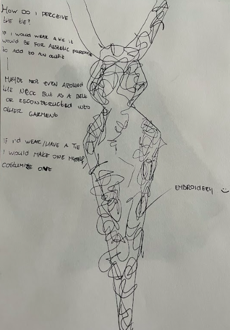 In the designs shown on the left, it was observed that most of those who chose to design a replacement fo the conventional tie, made them "less serious", "more comfortable", and "more aesthetically interesting". In addtion, some designed them to be worn in alternative ways as well- i.e. as a belt. An intersting trend to see was that many tried to design a tie, or a variation therof, that would make it more "worth" wearing.