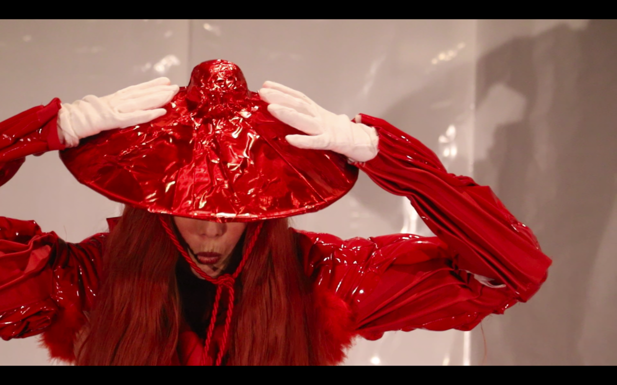 Charms’s body is a hybrid assemblage of transhistorical construction. The props that complete it are varied: a wide-brimmed hat with Eastern influence (merging an acritical interest in "exoticism" and the exogenous, emphasizing the hybrid nature of the costume), petrified eyes reminiscent of archaic statuary, long hair associated with femininity and wildness, white gloves (somewhere between magic and cartoon) that stand out from the body and highlight its humanity. Each of these bends to symbolism and technical intent to captivate. I highlight two in particular: