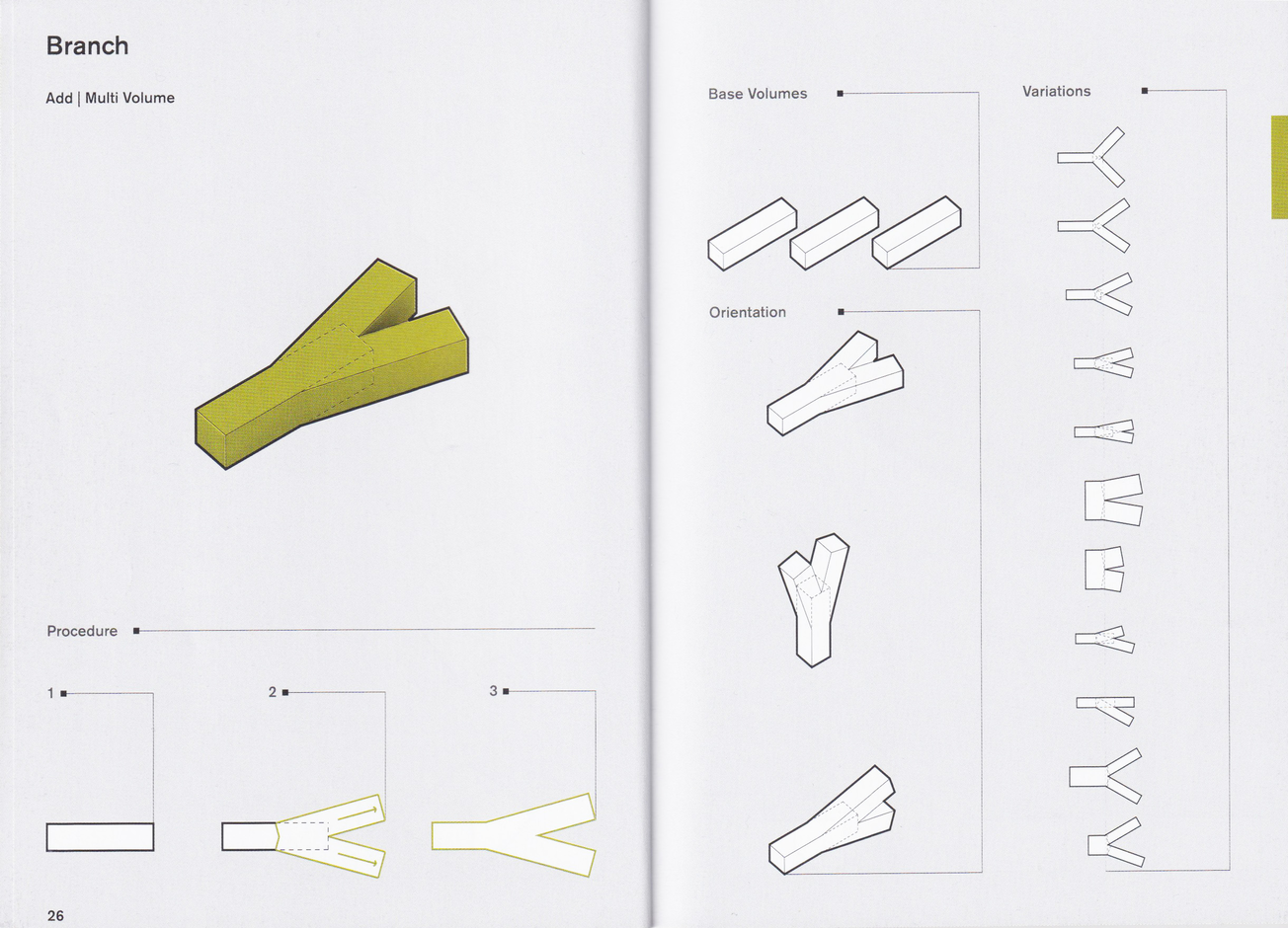 'Branch' generates a division of a single volume into multiple extensions, forming bifurcated or multi-directional geometries. Starting from a unified base, the volume splits into distinct arms or branches that radiate outward. The orientation and configuration of these extensions can vary, allowing for dynamic and divergent spatial arrangements while maintaining a connection to the original base form.