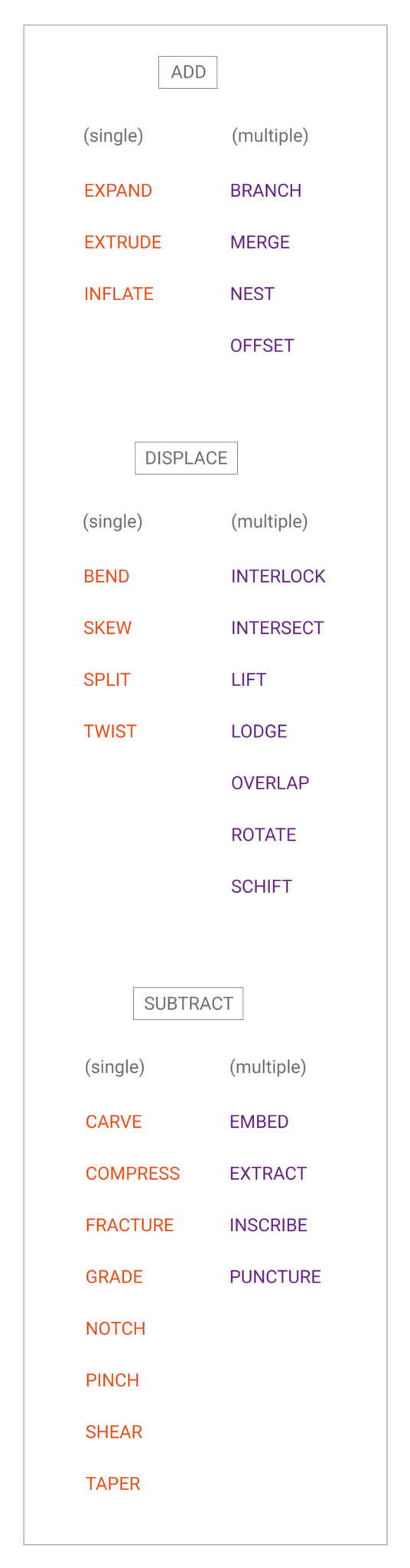 By approaching a word as a line, as a material articulation of aesthetic experience or thought exploration, we operate with words as with malleable materials. By taking a word for a walk, its meaning can experience a transition, influenced by the material agency and unique ability of a person’s body that merges with its surroundings. The words – the operative verbs – which Elena proposed for this exercise originate from the book “Operative Design” by architects Antoni Di Mari and Nora Yoo. In this concise volume, the authors compiled a glossary of basic architectural actions as fundamental dynamics for built spaces. The selection of thirty operative verbs is subdivided into three main categories: add, displace, and subtract. The verbs describe actions of a single basic volume (e.g., expand or twist), as well as the connection of two or more volumes (e.g., merge or overlap).
